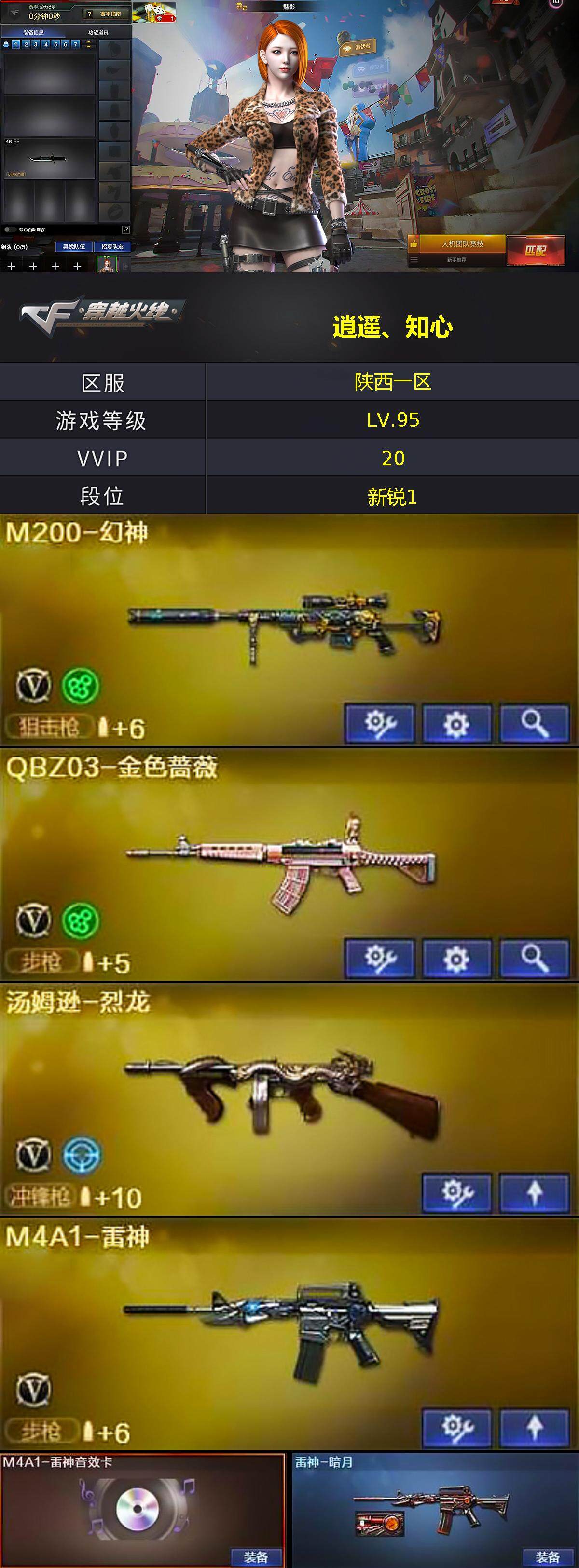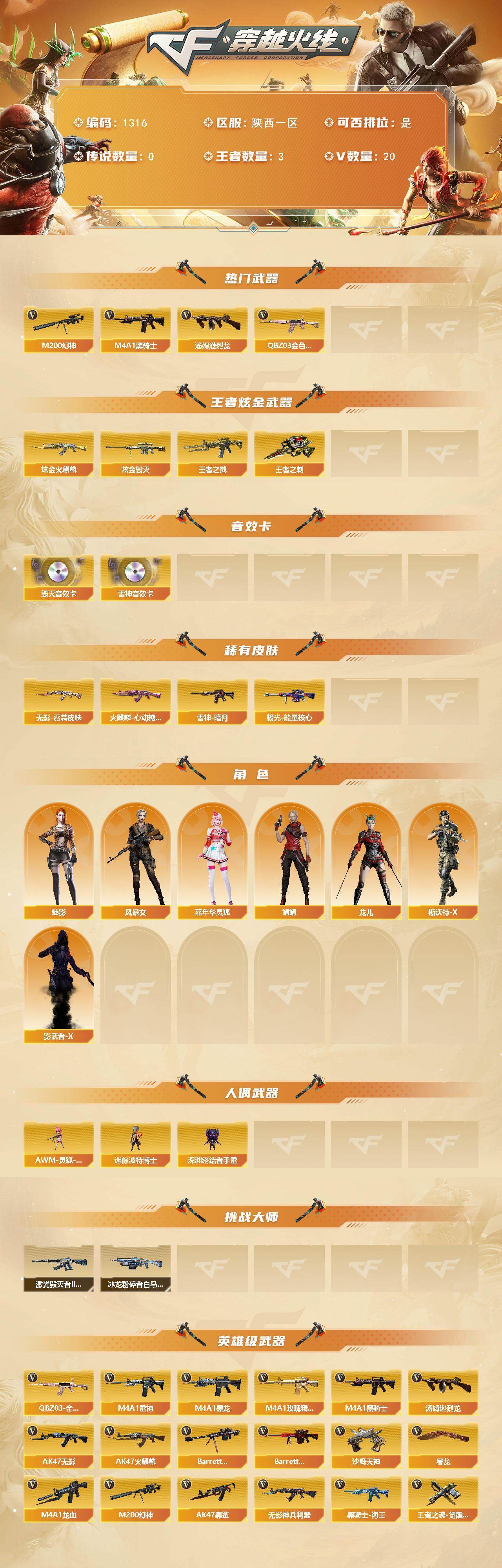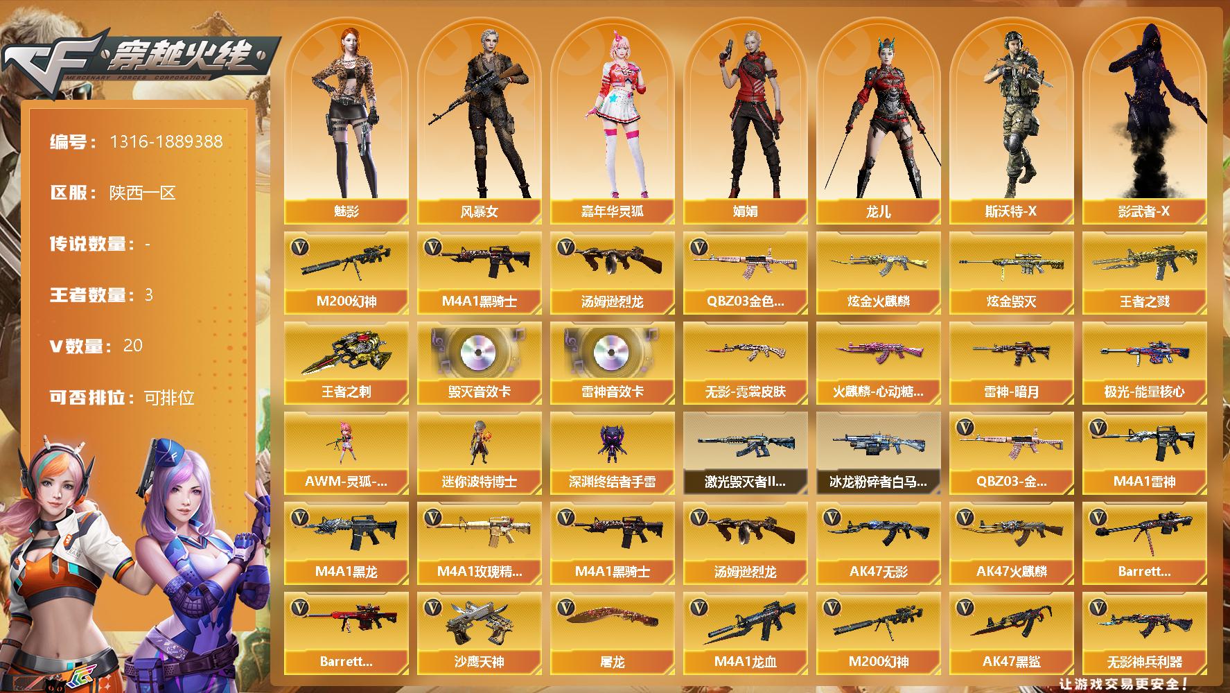 [15231200]陕西一区-20V-3王者-4炫金 【热门武器】:QBZ03-金色蔷薇,M200-幻神,M4A1-黑骑士,汤姆逊-烈龙 【王者炫金武器】:王者之戮,王者之刺,炫金火麒麟,炫金毁灭*3 【音效卡】:M4A1-雷神音效卡,Barrett-毁灭音效卡 【皮肤】:雷神-暗月,火麒麟-心动糖果,无影-霓裳皮肤,极光-能量核心 【角色】:魅影,风暴女,嘉年华灵狐,娟娟,龙儿,斯沃特-X,影武者-X 【人偶武