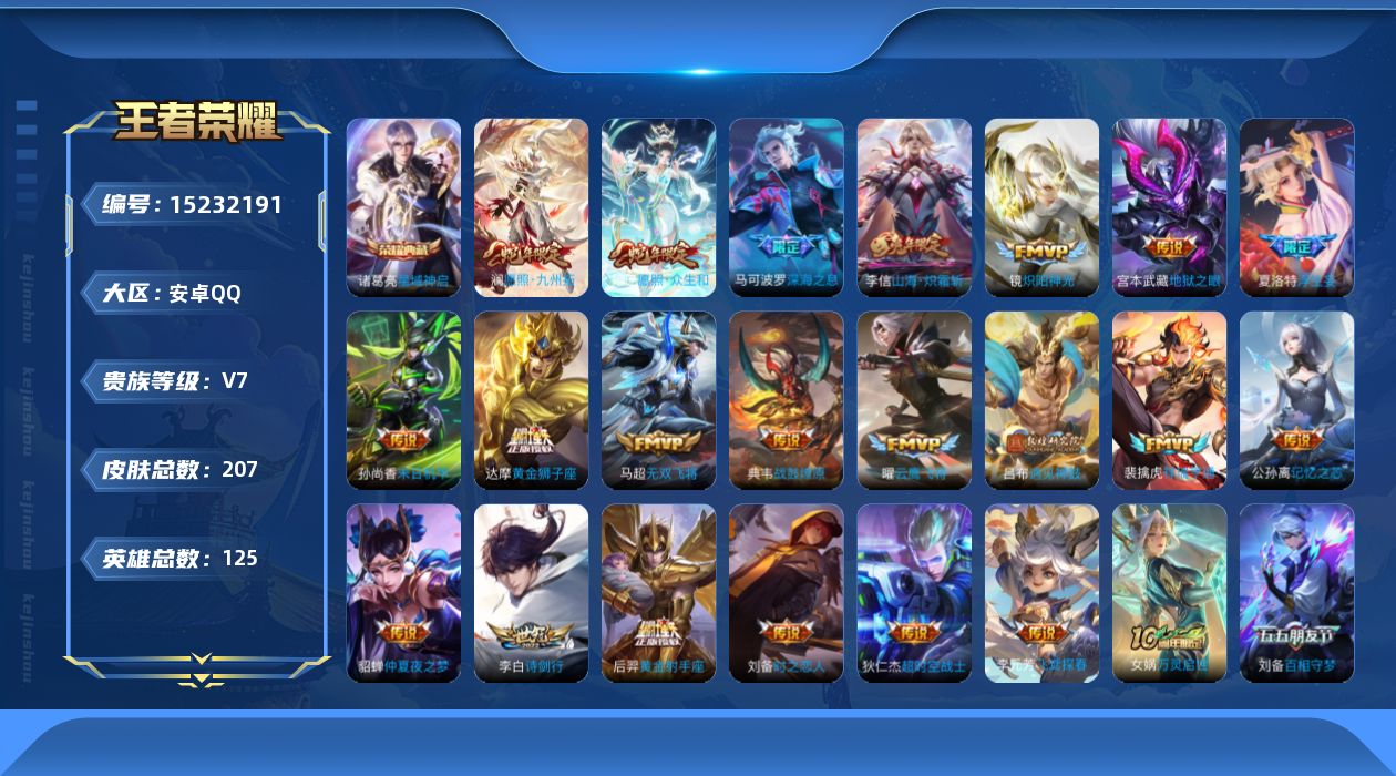 [15232191]【店主推荐捡漏号!可直接换绑】安卓Q-V7-最强王者段位-125英雄-207皮肤-1典藏皮肤-22传说-55史诗-1星元