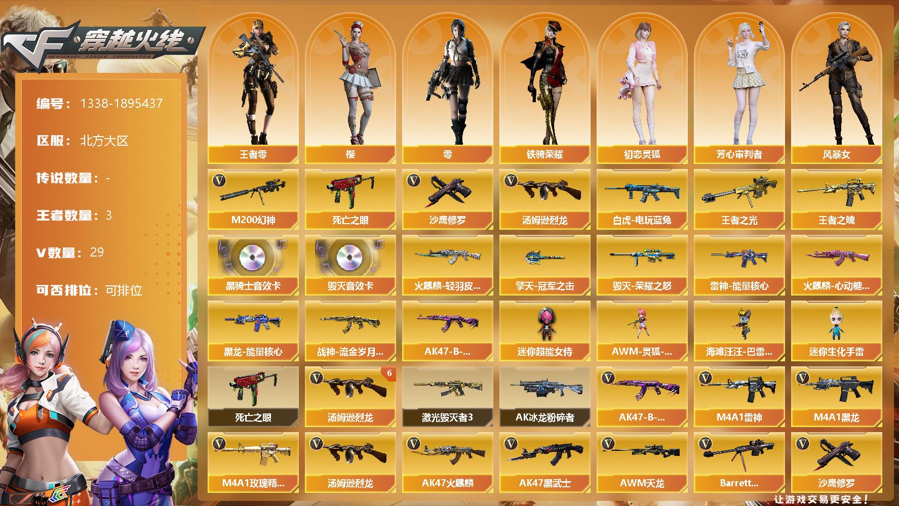 [15232614]北方大区-29V-3王者-0炫金 【热门武器】:M200-幻神,死亡之眼*2,白虎-电玩蓝兔,汤姆逊-烈龙*6,沙鹰-修罗 【王者炫金武器】:王者之魄,王者之光 【音效卡】:M4A1-黑骑士音效卡,Barrett-毁灭音效卡 【皮肤】:雷神-能量核心,火麒麟-轻羽皮肤,火麒麟-心动糖果,毁灭-荣耀之怒,黑龙-能量核心,战神-流金岁月皮肤*2,AK47-B-常胜将军-曹操,擎天-冠军之击 【角色