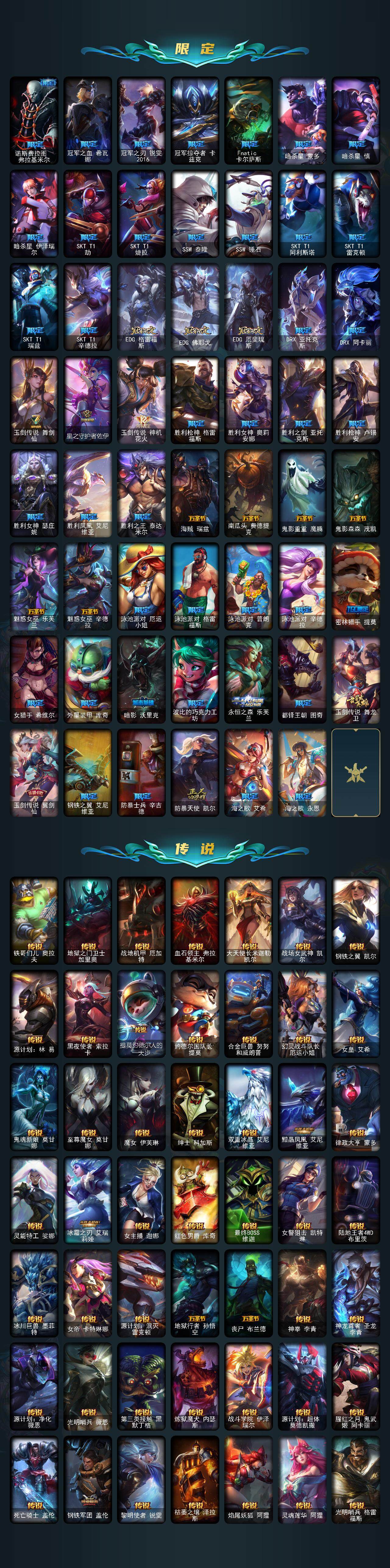 【限定皮肤】:诺斯费拉图弗拉基米尔,冠军之血希瓦娜,冠军之刃锐雯2016,冠军掠夺者卡兹克,Fnatic卡尔萨斯,暗杀星蒙多,暗杀星慎,暗杀星伊泽瑞尔,SKTT1劫,SKTT1婕拉,SSW泰隆,SSW锤石,SKTT1阿利斯塔,SKTT1雷克顿,SKTT1瑞兹,SKTT1辛德拉,EDG格雷福斯,EDG佛耶戈,EDG厄斐琉斯,DRX亚托克斯,DRX阿卡丽,玉剑传说舞剑仙