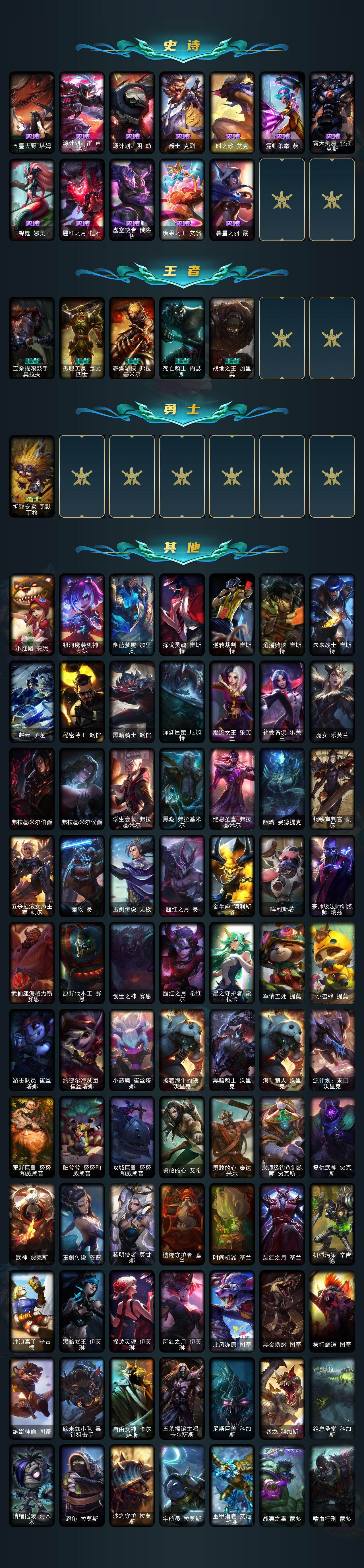 【臻彩皮肤】:龙的传人李青飞龙在天,神龙烈焰金克丝珍珠龙息,无畏骑士瑟庄妮赤子初心,神龙尊者圣龙李青龙腾云起,黎明使者锐雯黑夜使者,星之守护者金克丝黑洞,幻灵战斗队长厄运小姐勇气赞歌,殿堂传奇乐芙兰登神