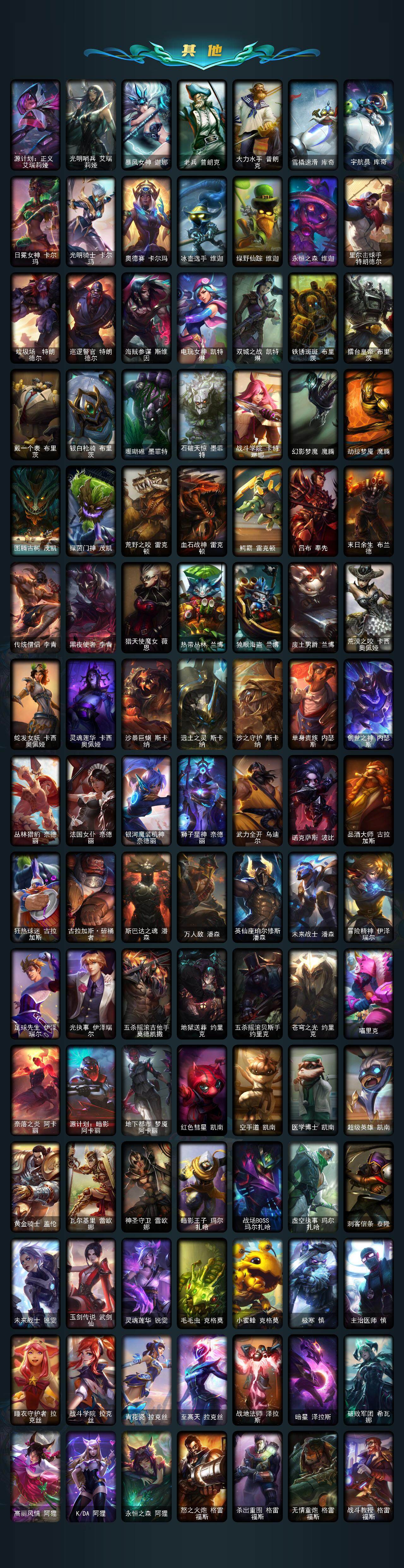 【冰雪限定】:幸福女神乐芙兰,圣诞开心鬼提莫,圣诞精灵崔丝塔娜,圣诞狂欢基兰,阿木木“主人不要我了”,胡桃夹子萨科,平安夜女神娑娜,雪默丁格,圣诞玩偶波比,圣诞老人古拉加斯,魄罗骑士瑟庄妮,冰雪节玛尔扎哈,冰雪兽纳尔,北极星神黛安娜