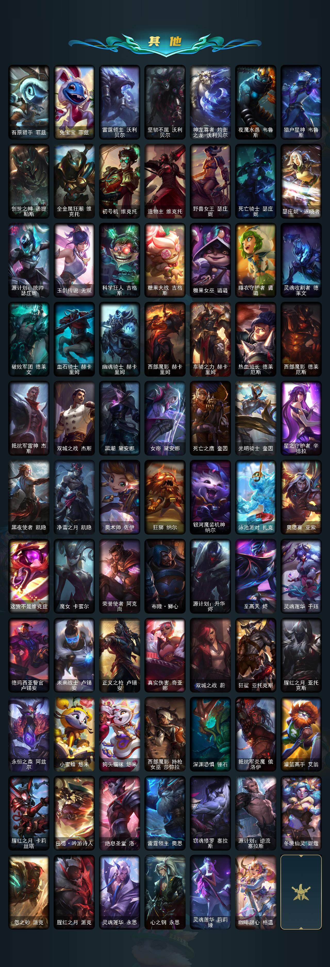 【至臻皮肤】:至臻KDA伊芙琳,至臻源计划正义艾瑞莉娅,至臻暗星墨菲特,至臻烈焰美人薇恩,至臻西部魔影猎天使恶魔泰隆,至臻神龙尊者均衡之龙沃利贝尔,至臻福牛守护者菲奥娜,至臻星之守护者辛德拉,至臻海之歌萨勒芬妮,至臻未来战士卢锡安,至臻神凰行者烈羽焰凰霞,至臻源计划逆流塞拉斯,至臻心之钢永恩