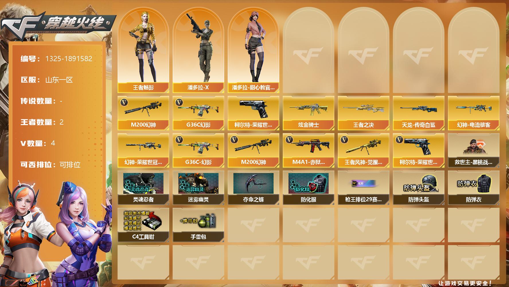 [15233083]山东一区-4V-2王者-1炫金 【热门武器】:G36C-幻影,M200-幻神*2,柯尔特-荣耀世冠白鲨2023 【王者炫金武器】:王者之决,炫金骑士 【皮肤】:幻神-电流骇客 皮肤,幻神-荣耀世冠白鲨2023 皮肤,AWM-天龙-传奇白鲨 【角色】:王者-魅影,潘多拉-X,潘多拉-甜心教官 【英雄级武器】:G36C-幻影,M200-幻神*2,王者风神-觉醒版,柯尔特-荣耀世冠白鲨2023,M4