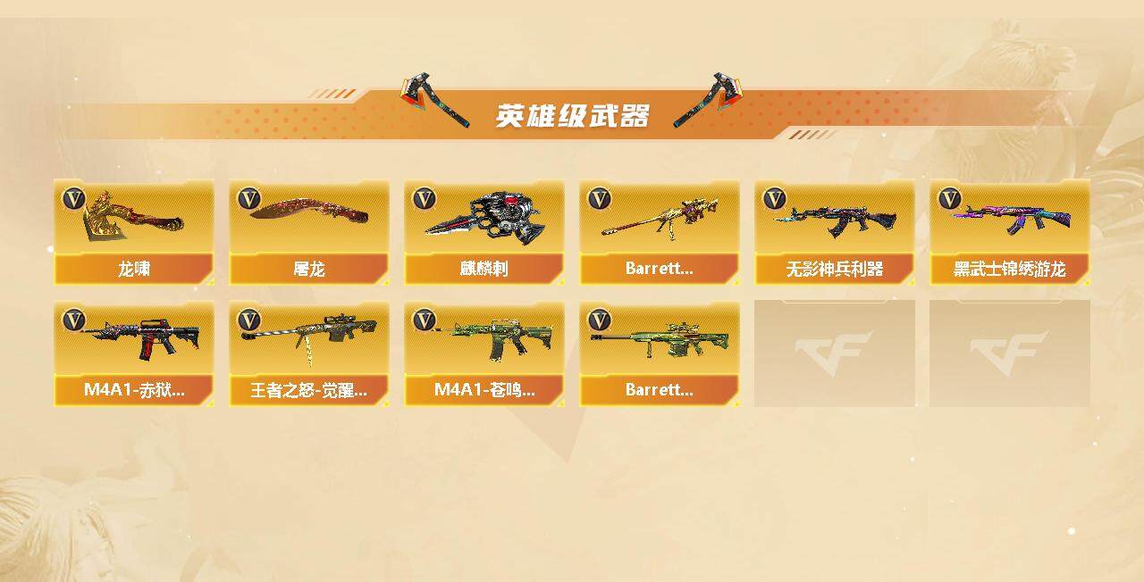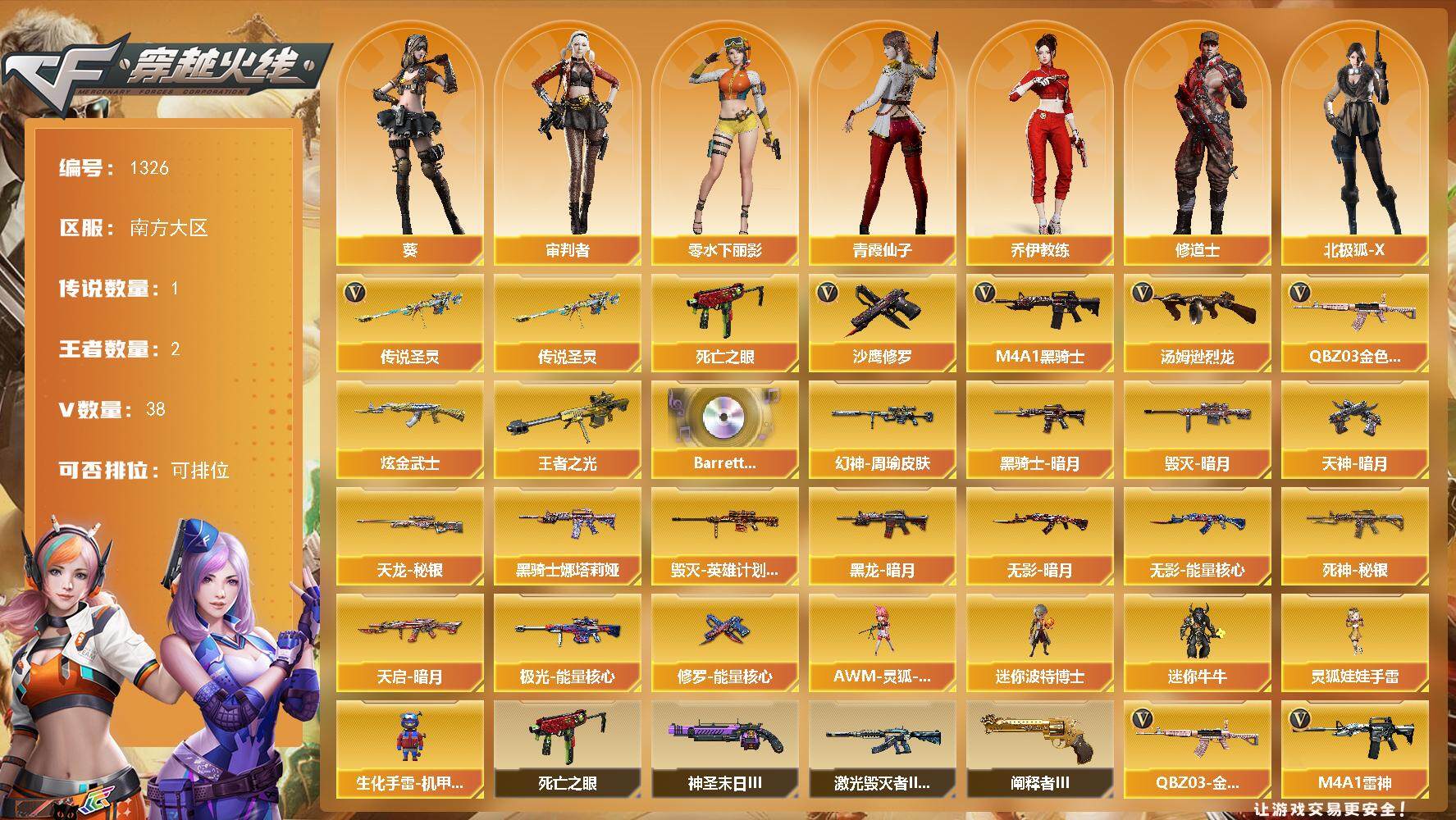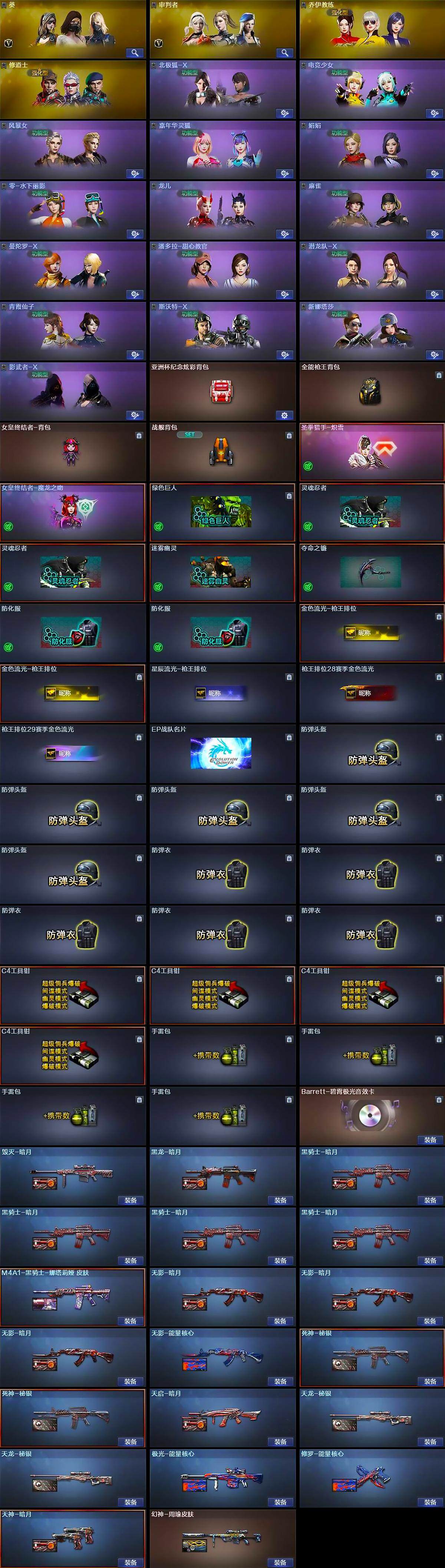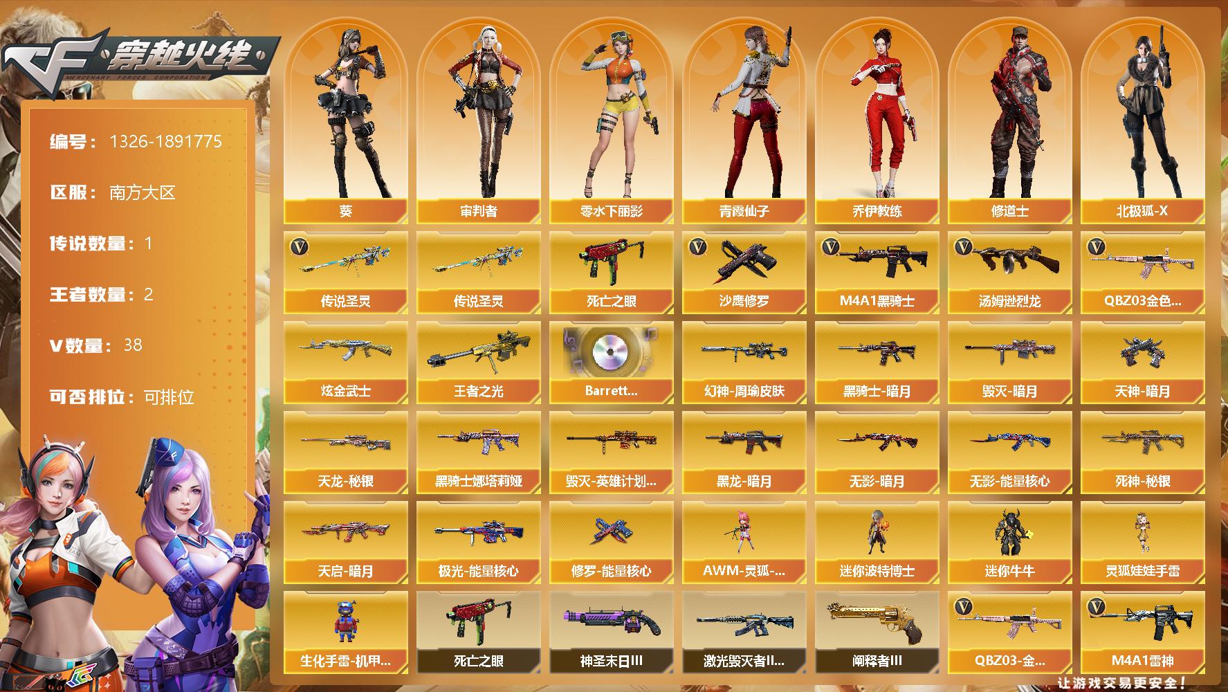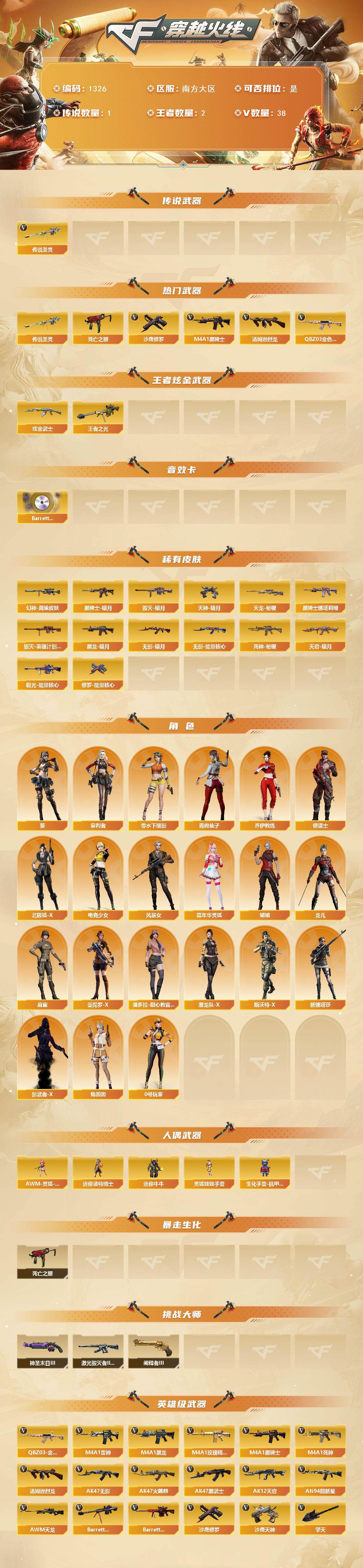 - [15563251]上海一区-46V-4王者-0炫金 【热门武器】:QBZ03-金色蔷薇,M200-幻神,死亡之眼,荣耀世冠-火麒麟*2,荣耀世冠-雷神,白虎-电玩蓝兔,荣耀世冠-柯尔特,M4A1-黑骑士,羊驼玩偶,沙鹰-修罗*3,荣耀世冠-龙啸 【音效卡】:M200-幻神音效卡,M4A1-雷神音效卡,M4A1-黑骑士音效卡,Barrett-毁灭音效卡,麒麟刺-百战金芒-盛典舞曲音效卡,炼狱-百战金芒-庆典舞曲音效卡,死神-雪域霜狐-怀旧音效卡,柯尔特-百战金芒-庆典舞曲音效卡 【皮肤】:M200-幻神-黄忠皮肤,幻神-宠儿-2021MVP,M200-幻神-N9-2022MVP,幻神-荣耀世冠EP 皮肤,白虎-AG-CFPLS20冠军,白虎-百战金芒 皮肤,QBZ03-荣耀世冠EP 皮肤,金色蔷薇-电竞之星 皮肤,Kar98K-星神-冠军之星皮肤,雷神-荣耀之魄,雷神-虎将,雷神-冠军之魄,雷神-荣耀世冠AG,雷神-机甲刑天皮肤,雷神-宇航兔皮肤,雷神-维纳斯皮肤,雷神-源计划2.0专属 皮肤,M4A1-再燃火线,雷神-神秘按键 皮肤,AK47-火麒麟-传奇EVEN,火麒麟-平天大圣,火麒麟-荣耀世冠AG,火麒麟-百城*2,毁灭-黑大圣皮肤,毁灭-风暴,毁灭-英雄计划 皮肤,M4A1-黑骑士-娜塔莉娅 皮肤,战神-流金岁月皮肤*3,AK47-B-常胜将军-孙权,天龙-能量核心,AWM-天龙-传奇70KG,AWM-天龙-传奇白鲨,修罗-冠军之魂*2,屠龙-荣耀世冠AG,屠龙-巅峰荣耀 皮肤,龙啸-冠军之啸,轻型军用手斧-再燃火线 【角色】:王者春,雪域霜狐,奇洋探员,乔伊教练,修道士,空,暗夜-X,电竞少女,风暴女*2,嘉年华灵狐,卡塔琳娜,兰-新年限定,0号玩家,灵狐者-七夕宝贝,龙儿-小淘气,曼陀罗-X,曼陀罗-礼服,潘多拉-X,潘多拉-甜心教官,青霞仙子,蜀雪,铁骑荣耀,维纳斯,雪莉杨-摸金校尉,夜玫瑰-幻能朋克,夜玫瑰-宠粉,幽,游珑儿 【人偶武器】:AWM-灵狐-15周年嘉年华,迷你牛魔王,迷你牛牛*2,生化手雷-机甲核心,深渊终结者手雷,迷你超能女侍 【暴走生化】:死亡之眼,超级对讲机 【挑战大师】:冰龙粉碎者-白马银枪,激光毁灭者III-白马银枪,神圣爆裂者-末日III 【英雄级武器】:AK47-火麒麟,M4A1-黑龙,M4A1-雷神*2,M4A1-黑骑士,无影-神兵利器