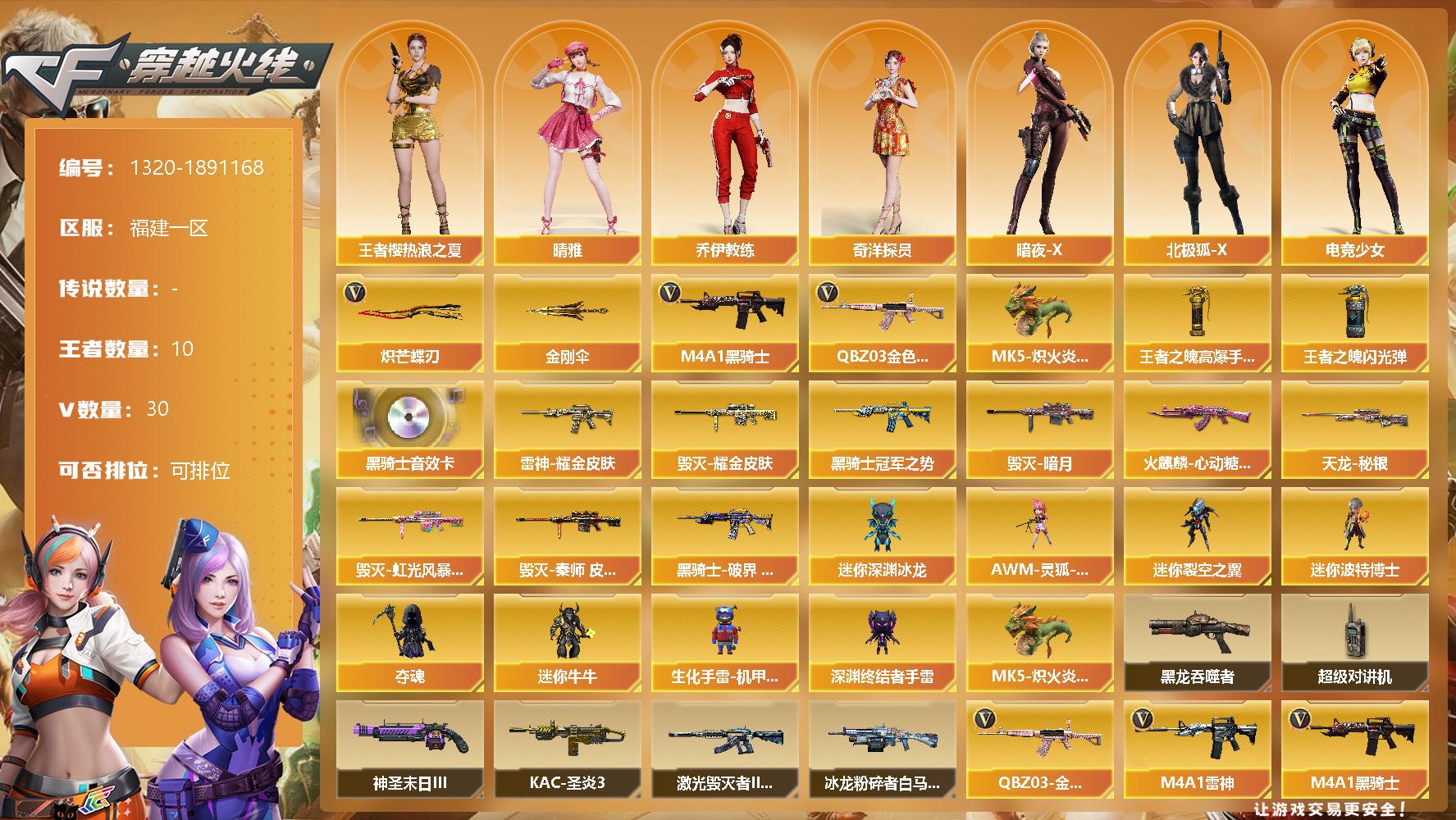 [15233294]福建一区-30V-10王者-0炫金 【传说角色】:传说影煞 【热门武器】:QBZ03-金色蔷薇,M4A1-黑骑士,MK5-炽火炎龙,炽芒蝶刃,金刚伞 【王者炫金武器】:王者之魄高爆手雷,王者之魄闪光弹*3 【音效卡】:M4A1-黑骑士音效卡 【皮肤】:雷神-耀金皮肤,火麒麟-心动糖果,毁灭-暗月,毁灭耀金皮肤,毁灭-虹光风暴 皮肤,毁灭-秦师 皮肤,黑骑士-冠军之势,黑骑士-破界 皮肤,天龙-