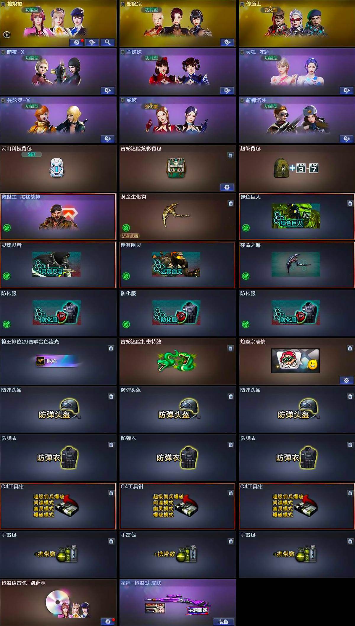 - [15241138]北京二区-99V-17王者-2炫金 【热门武器】:死亡之眼,QBZ03-街机,M4A1-黑骑士*2,汤姆逊-烈龙*6,RPK-盘龙*7,沙鹰-修罗*6 【王者炫金武器】:炫金毁灭,炫金雷神,王者之戮,王者之武,玫瑰精灵-悦动,王者之光,王者之影,王者之怒,王者之力,王者之魄,王者之心,王者之魂,王者之击,王者之锋 【音效卡】:AK47-火麒麟音效卡,M4A1-黑骑士音效卡,Barrett-毁灭音效卡 【稀有皮肤】:雷神-能量核心,雷神-荣耀之魄,雷神-虎将*2,火麒麟-平天大圣,黑骑士-暗月,毁灭-荣耀之怒,毁灭耀金皮肤,毁灭-黑大圣皮肤,AWM-天龙-传奇白鲨,烈龙-星空,天神-暗月,屠龙-荣耀之锋 【角色】:王者-零,零-水下丽影,审判者,葵,樱,战地猎狐,铁骑荣耀 【人偶武器】:M37-葵,迷你深渊冰龙,迷你裂空之翼,迷你牛牛,生化手雷-机甲核心,闪光弹-小乔,闪光弹-貂蝉,高爆手雷-大乔 【暴走生化】:死亡之眼,超级对讲机 【挑战大师】:神圣爆裂者III,KAC-圣炎切割者III,阐释者III,激光毁灭者III,激光毁灭者III-白马银枪,冰龙粉碎者-白马银枪,致命乱世-超越Max 【英雄级武器】:马来剑-夜魔,M4A1-武圣,Glock18-武圣,M4A1-雷神*5,M4A1-黑龙,M4A1-玫瑰精灵*2,M4A1-黑骑士*2,RPK-盘龙*7,汤姆逊-烈龙*6,AK47-无影,AK47-火麒麟*4,AK47-黑武士*2,AN94-超新星,AWM-天龙,Barrett-毁灭*5,Barrett-极光,M4A1-龙血,M4A1-千变*4,死神-雪域霜狐,AK-47-猩红传说,AK47-B-战神,AK47-B-常胜将军,AWM-昌龙,M4A1-赤狱骑士,沙鹰-天神*7,沙鹰-修罗*6,麒麟刺*3,擎天*7,龙啸,屠龙*9 【特殊枪械】:2黑骑士,6烈龙,6盘龙