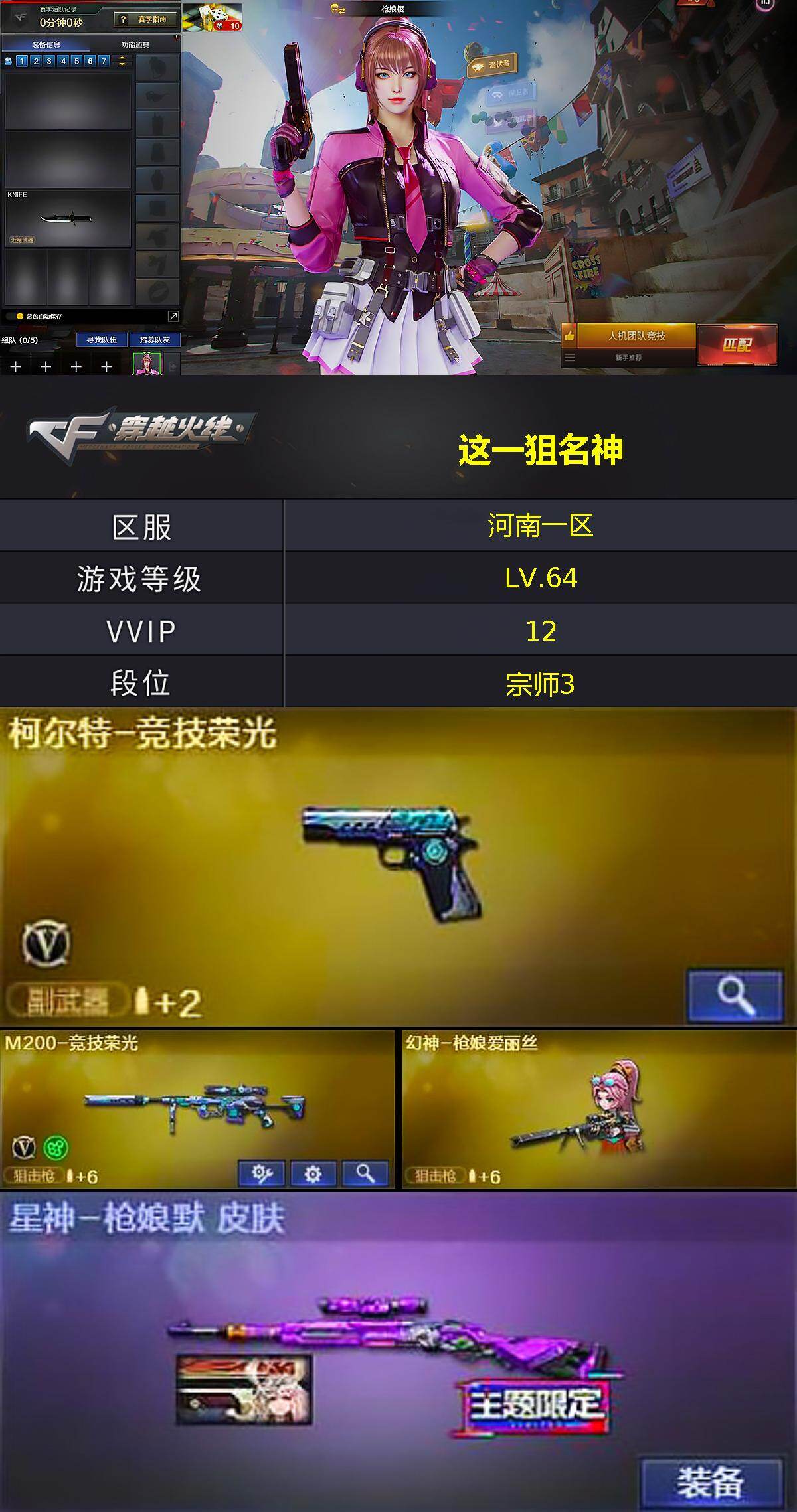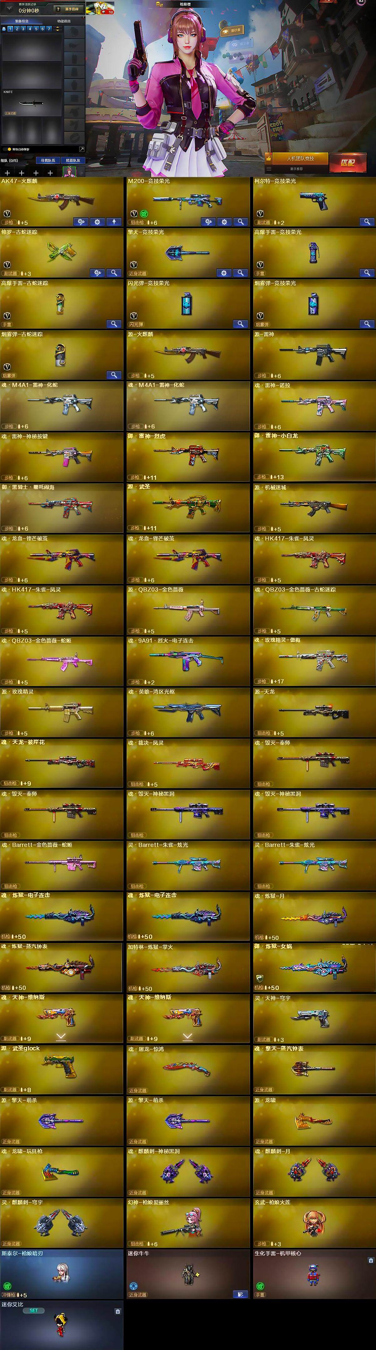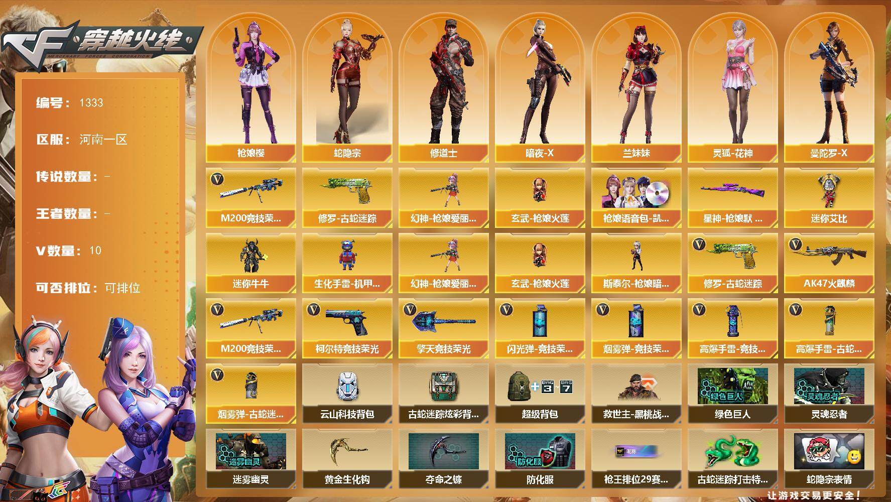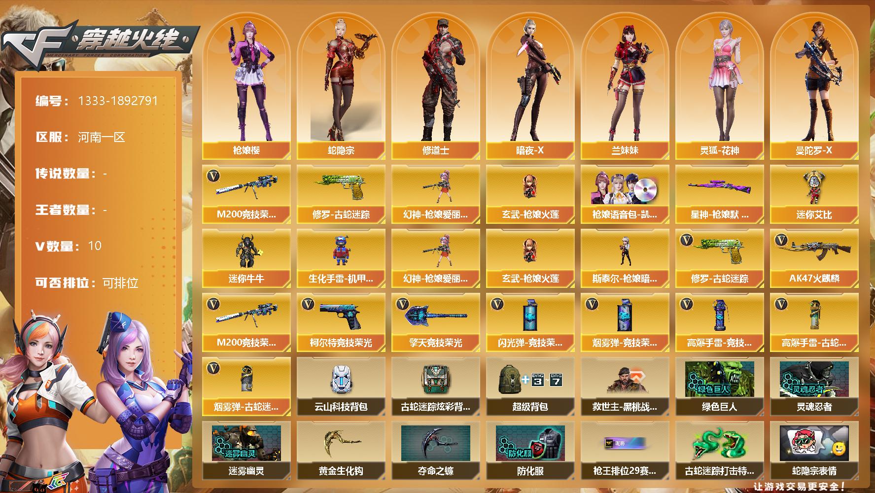 [15233655]河南一区-10V-0王者-0炫金 【热门武器】:修罗-古蛇迷踪,M200-竞技荣光,幻神-枪娘爱丽丝,玄武-枪娘火莲 【音效卡】:枪娘语音包-凯萨林 【皮肤】:星神-枪娘默 皮肤 【角色】:枪娘樱,蛇隐宗,修道士,暗夜-X,疾风,兰妹妹,灵狐-花神,曼陀罗-X,蛇姬,兔囡囡,新娜塔莎,智影 【人偶武器】:幻神-枪娘爱丽丝,玄武-枪娘火莲,斯泰尔-枪娘暗刃,迷你牛牛,生化手雷-机甲核心,迷你艾比