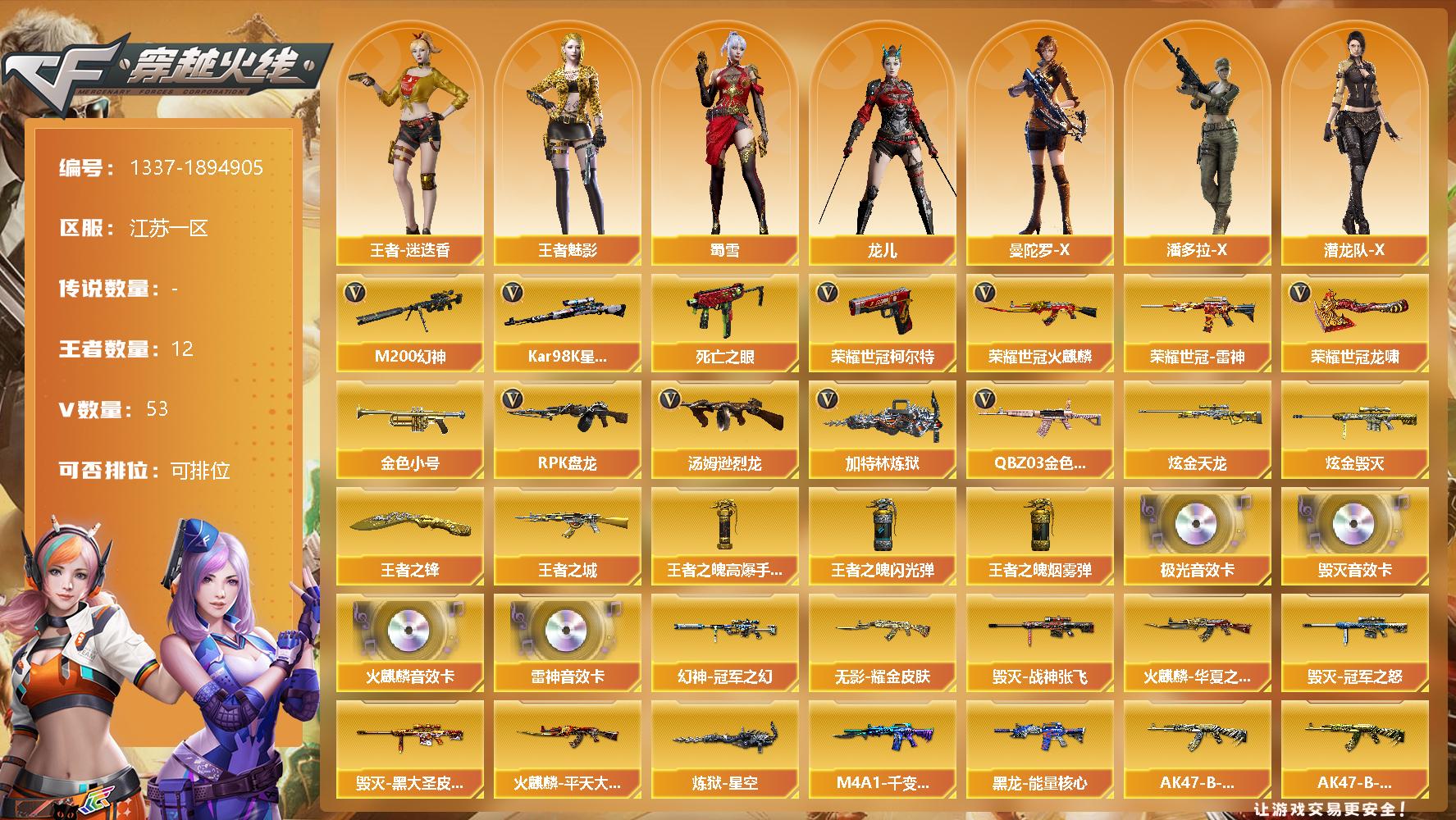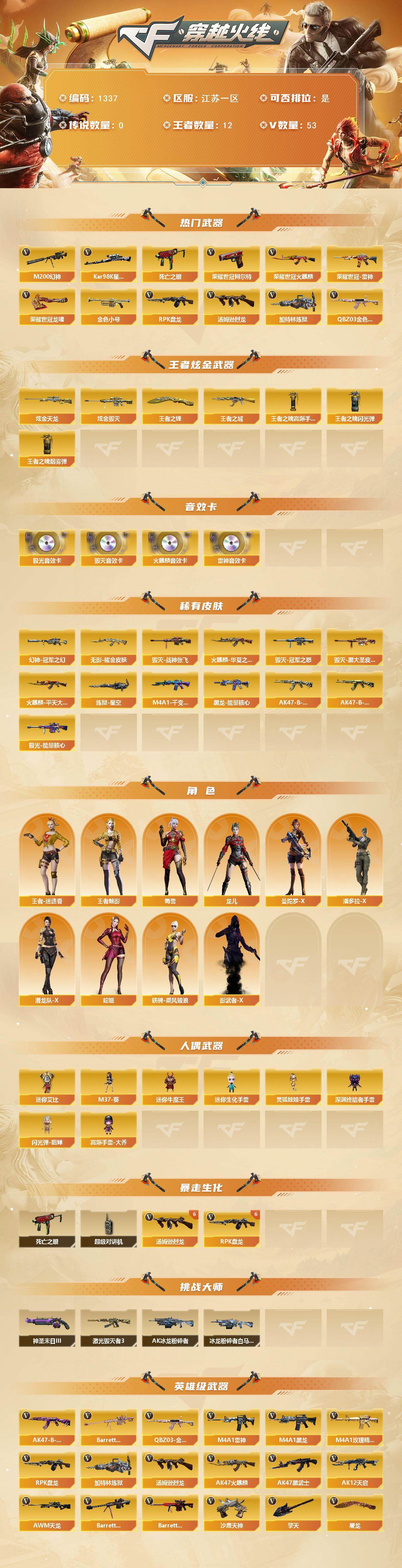 [15233787]江苏一区-53V-12王者-3炫金 【热门武器】:QBZ03-金色蔷薇,M200-幻神,死亡之眼*2,荣耀世冠-火麒麟,荣耀世冠-雷神,荣耀世冠-柯尔特,Kar98K-星神,金色小号,汤姆逊-烈龙*6,RPK-盘龙*6,加特林-炼狱,荣耀世冠-龙啸 【王者炫金武器】:王者之城,王者之锋*2,炫金毁灭*2,炫金天龙,王者之魄高爆手雷*2,王者之魄闪光弹*3,王者之魄烟雾弹*2 【音效卡】:AK4