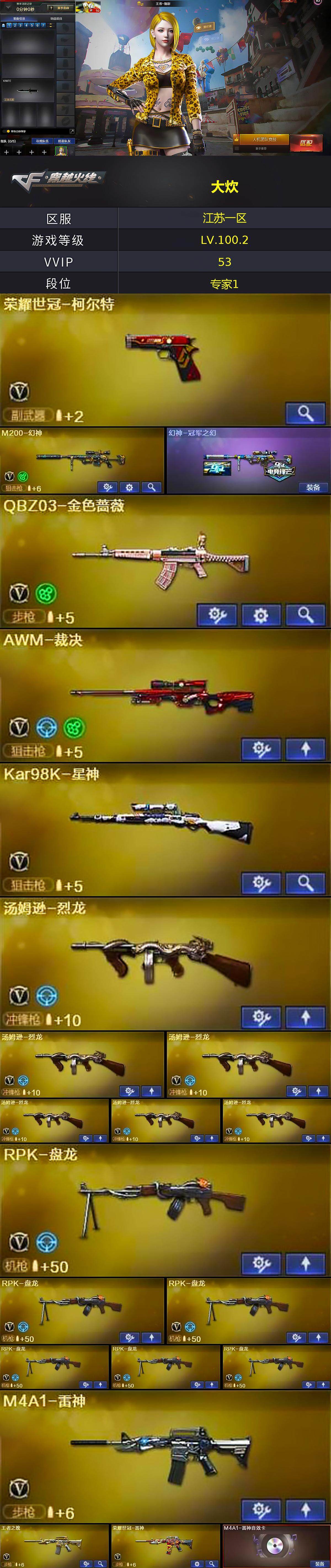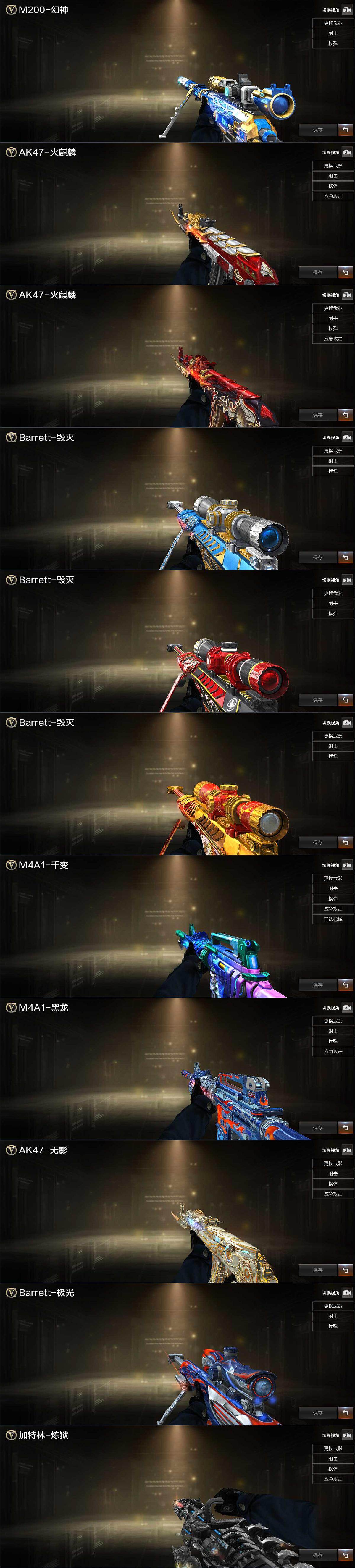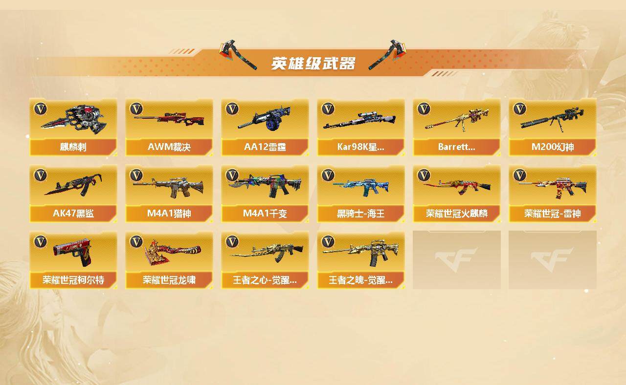 【热门武器】:QBZ03-金色蔷薇,M200-幻神,死亡之眼*2,荣耀世冠-火麒麟,荣耀世冠-雷神,荣耀世冠-柯尔特,Kar98K-星神,金色小号,汤姆逊-烈龙*6,RPK-盘龙*6,加特林-炼狱,荣耀世冠-龙啸