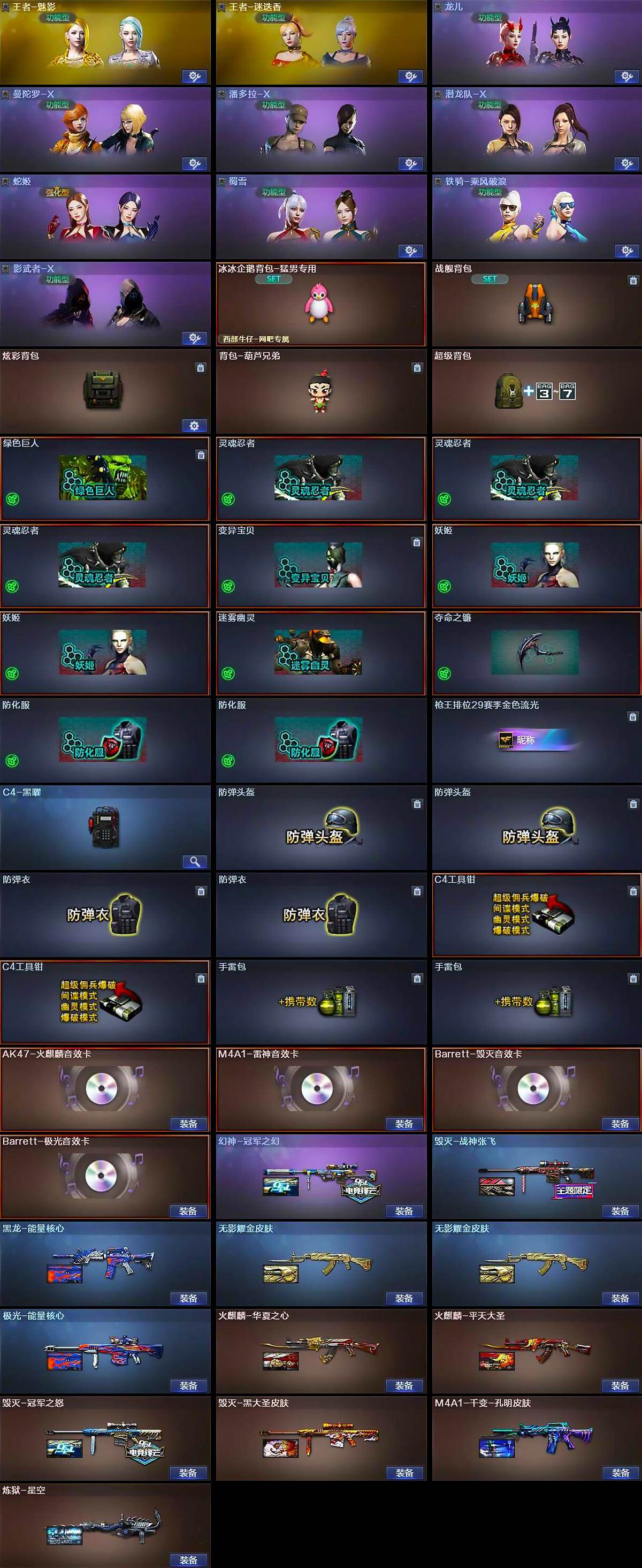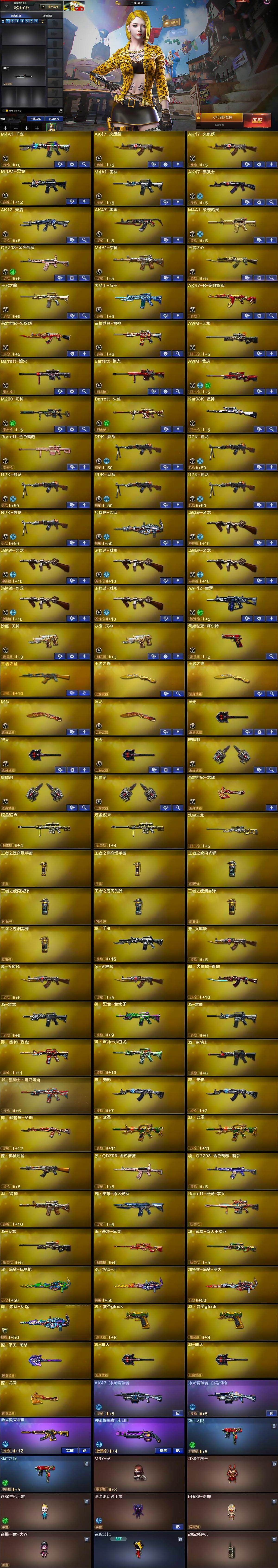 - [12782618]南方大区-20V-1王者-1炫金 【热门武器】:QBZ03-金色蔷薇,金色蔷薇-古蛇迷踪,修罗-古蛇迷踪,M200-竞技荣光,牛牛-AK47,COP-白鲨,沙鹰-修罗,炽芒蝶刃 【王者炫金武器】:炫金毁灭 【音效卡】:M4A1-黑骑士音效卡,QBZ03-金色蔷薇-古蛇迷踪音效卡 【稀有皮肤】:金色蔷薇-破浪逐光 皮肤,火麒麟-百城,毁灭-黑大圣皮肤 【角色】:王者-迷迭香,蜀雪,青霞仙子 【人偶武器】:COP-白鲨,牛牛-AK47,迷你巨石泰坦-魔花研究所,迷你牛魔王,迷你波特博士,夺魂,迷你牛牛*2,灵狐娃娃手雷,生化手雷-机甲核心,深渊终结者手雷 【挑战大师】:神圣爆裂者-末日III,激光毁灭者III-白马银枪,冰龙粉碎者-白马银枪 【英雄级武器】:M200-竞技荣光,高爆手雷-竞技荣光,烟雾弹-竞技荣光,闪光弹-竞技荣光,烈火-动感闪耀,天神-动感闪耀,屠龙-动感闪耀,手雷-动感闪耀,QBZ03-金色蔷薇,金色蔷薇-古蛇迷踪,无影-神兵利器,M4A1-雷神,AWM-裁决,黑武士-锦绣游龙,黑骑士-海王,超新星-热带奇洋,AK47-B-战神,M4A1-赤狱骑士,修罗-古蛇迷踪,沙鹰-修罗,炽芒蝶刃,擎天-云海游龙,龙啸-热带奇洋 【特殊枪械】: