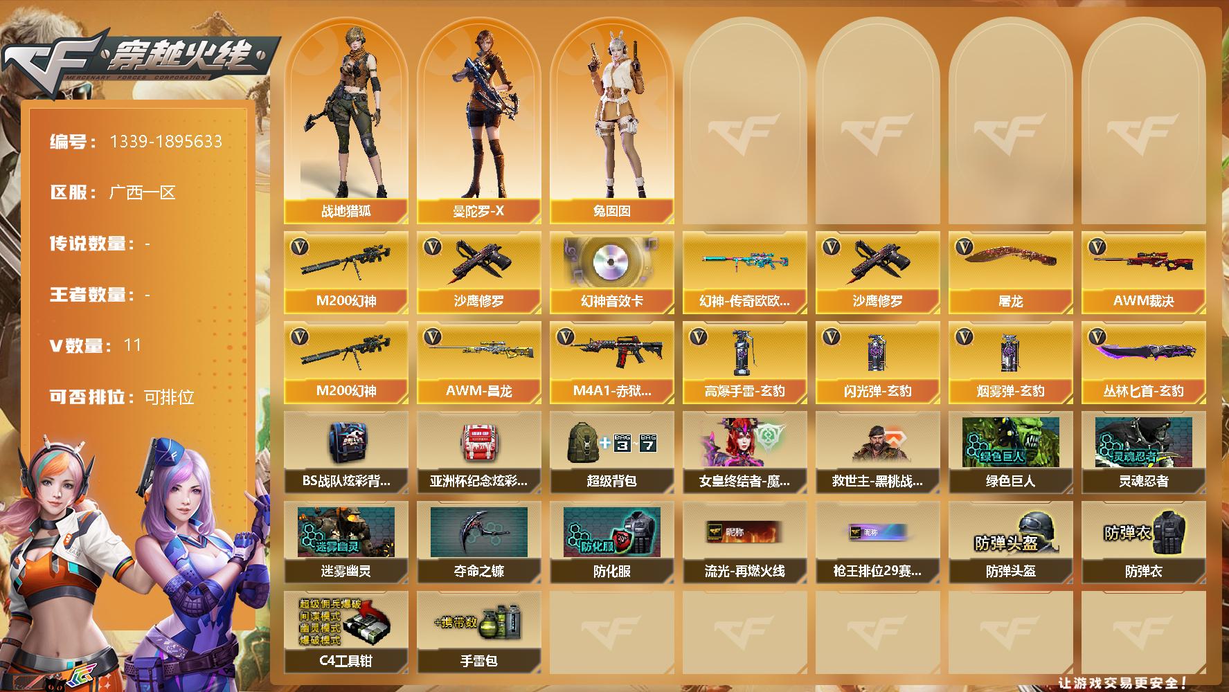 [15233964]广西一区-11V-0王者-0炫金 【热门武器】:M200-幻神,沙鹰-修罗 【音效卡】:M200-幻神音效卡 【皮肤】:幻神-传奇欧欧 皮肤 【角色】:战地猎狐,曼陀罗-X,兔囡囡 【英雄级武器】:AWM-裁决,M200-幻神,沙鹰-修罗,屠龙,丛林匕首-玄豹,高爆手雷-玄豹,闪光弹-玄豹*2,烟雾弹-玄豹,M4A1-赤狱骑士,AWM-昌龙 【道具】:BS战队炫彩背包,亚洲杯纪念炫彩背包,超级