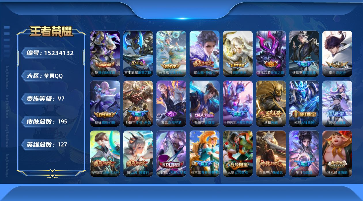 [15234132]【店主推荐捡漏号!可直接换绑】苹果Q-V7-最强王者段位-127英雄-195皮肤-1典藏皮肤-9传说-43史诗-1星元