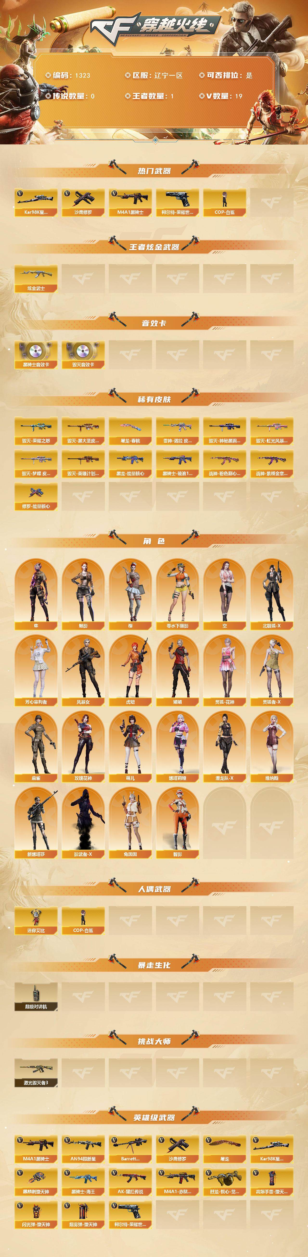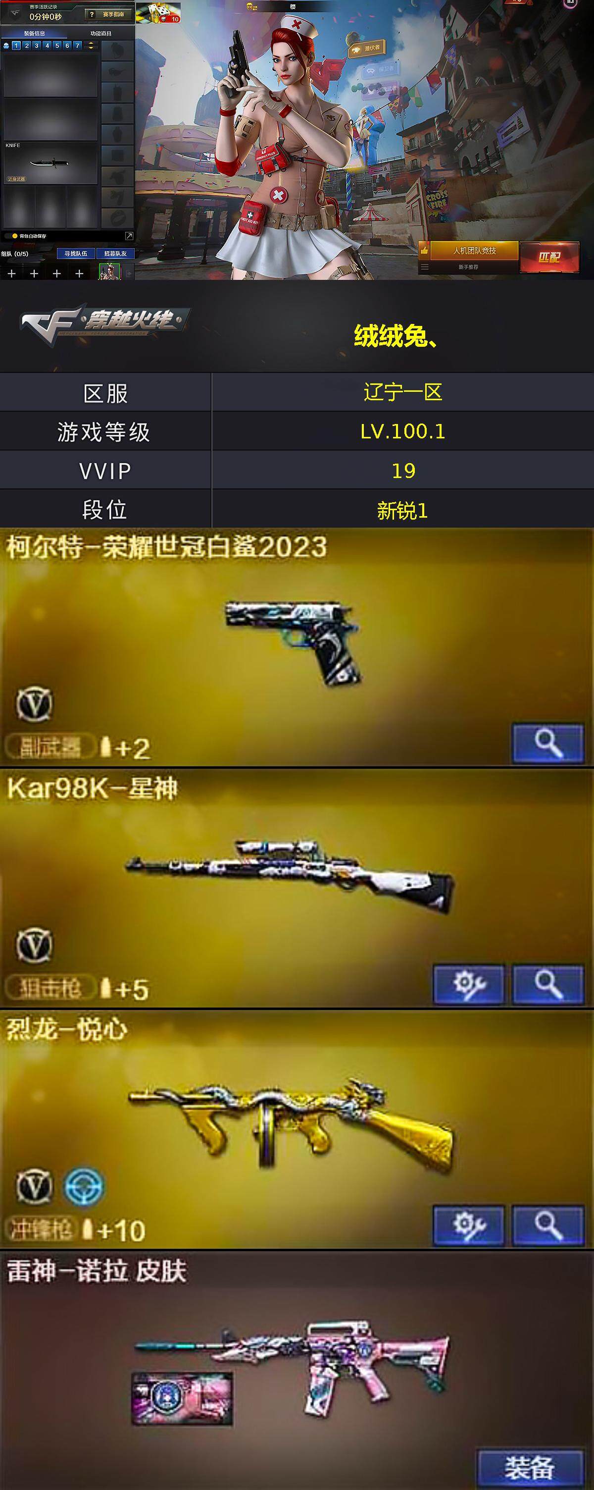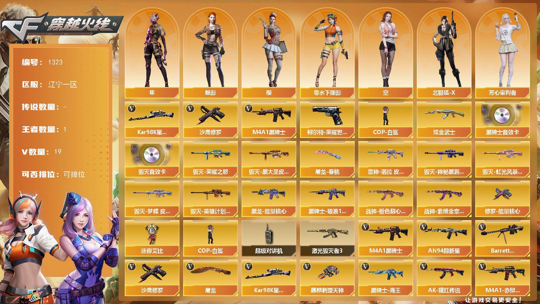 [15234540]辽宁一区-19V-1王者-1炫金 【热门武器】:柯尔特-荣耀世冠白鲨2023,Kar98K-星神,M4A1-黑骑士,COP-白鲨,沙鹰-修罗 【王者炫金武器】:炫金武士 【音效卡】:M4A1-黑骑士音效卡,Barrett-毁灭音效卡 【皮肤】:雷神-诺拉 皮肤,毁灭-荣耀之怒,毁灭-黑大圣皮肤,毁灭-神秘黑洞皮肤,毁灭-虹光风暴 皮肤,毁灭-梦蝶 皮肤,毁灭-英雄计划 皮肤,黑龙-能量核心,黑骑士-破浪10年皮肤,战神-粉色甜心皮肤,战神-紫绶金章皮肤*3,修罗-能量核心,屠龙-春桃 皮肤 【角色】:樱,魅影,隼,空,北极狐-X,芳心审判者,风暴女,虎妞,娟娟,零-水下丽影,灵狐-花神,灵狐者-X,麻雀,玫瑰花神,萌儿,娜塔莉娅,潜龙队-X,兔囡囡,维纳斯,新娜塔莎,影武者-X,智影 【人偶武器】:COP-白鲨,迷你艾比 【暴走生化】:超级对讲机 【挑战大师】:激光毁灭者III 【英雄级武器】:M4A1-黑骑士,AN94-超新星,AK-47-猩红传说*2,黑骑士-海王,Barrett-毁灭,Kar98K-星神,烈龙-悦心-觉醒版,沙鹰-修罗,柯尔特-荣耀世冠白鲨2023,屠龙*2,麒麟刺-堕天神,高爆手雷-堕天神,闪光弹-堕天神,烟雾弹-堕天神,M4A1-赤狱骑士 【道具】:EP战队炫彩背包,亚洲杯纪念炫彩背包,奇洋探员-海龟背包,机械魔影背包-红色,炫彩背包-诺拉,背包-洛丽塔,超级背包,救世主-黑桃战神,黄金生化钩,绿色巨人,灵魂忍者,迷雾幽灵,夺命之镰,防化服*2,枪王排位29赛季金色流光,防弹头盔*2,防弹衣*2,C4工具钳*2,手雷包*3 【特殊枪械】:1黑骑士