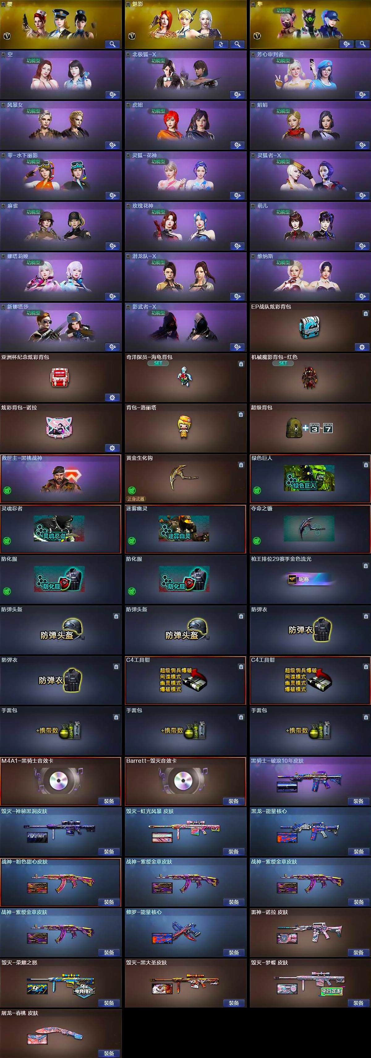 【道具】:EP战队炫彩背包,亚洲杯纪念炫彩背包,奇洋探员-海龟背包,机械魔影背包-红色,炫彩背包-诺拉,背包-洛丽塔,超级背包,救世主-黑桃战神,黄金生化钩,绿色巨人,灵魂忍者,迷雾幽灵,夺命之镰,防化服*2,枪王排位29赛季金色流光,防弹头盔*2,防弹衣*2,C4工具钳*2,手雷包*3