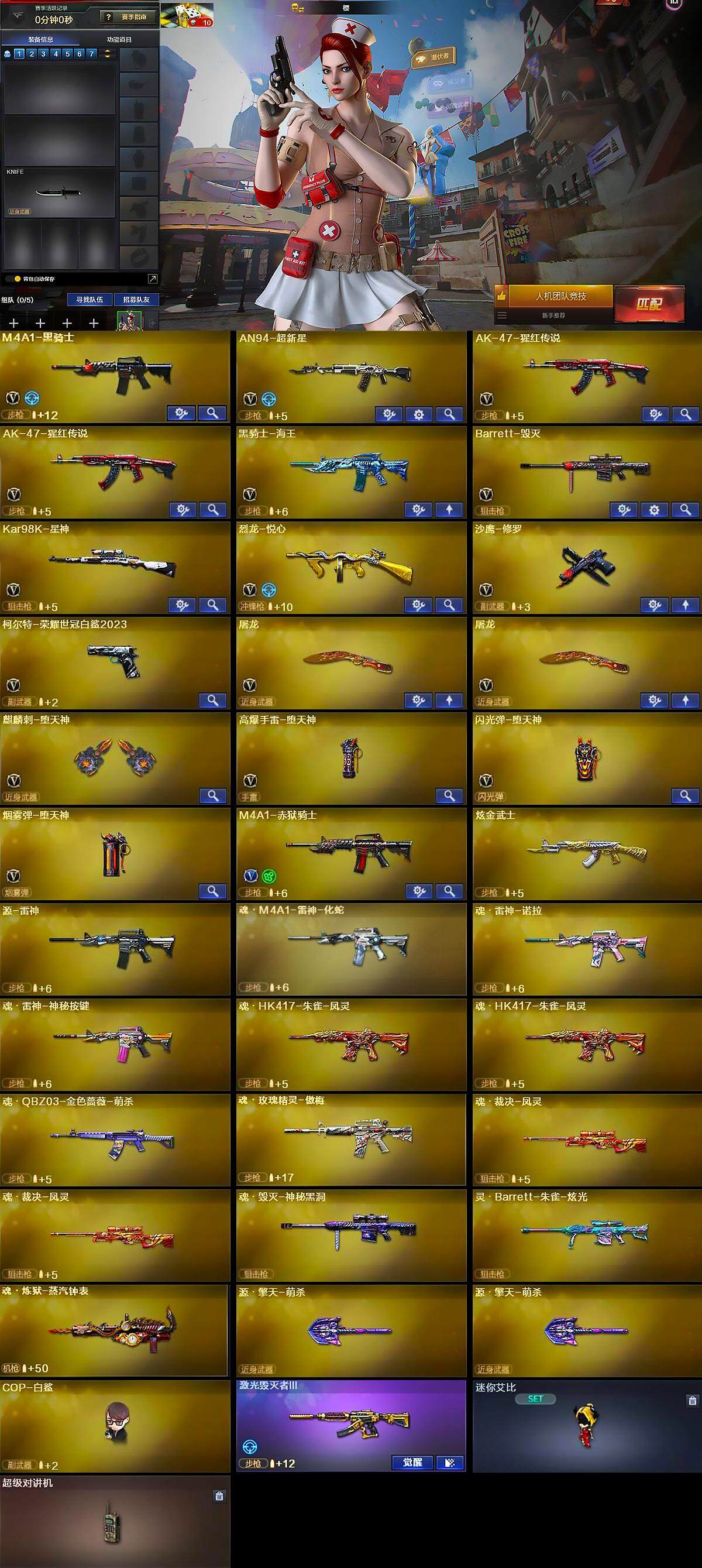 【英雄级武器】:M4A1-黑骑士,AN94-超新星,AK-47-猩红传说*2,黑骑士-海王,Barrett-毁灭,Kar98K-星神,烈龙-悦心-觉醒版,沙鹰-修罗,柯尔特-荣耀世冠白鲨2023,屠龙*2,麒麟刺-堕天神,高爆手雷-堕天神,闪光弹-堕天神,烟雾弹-堕天神,M4A1-赤狱骑士