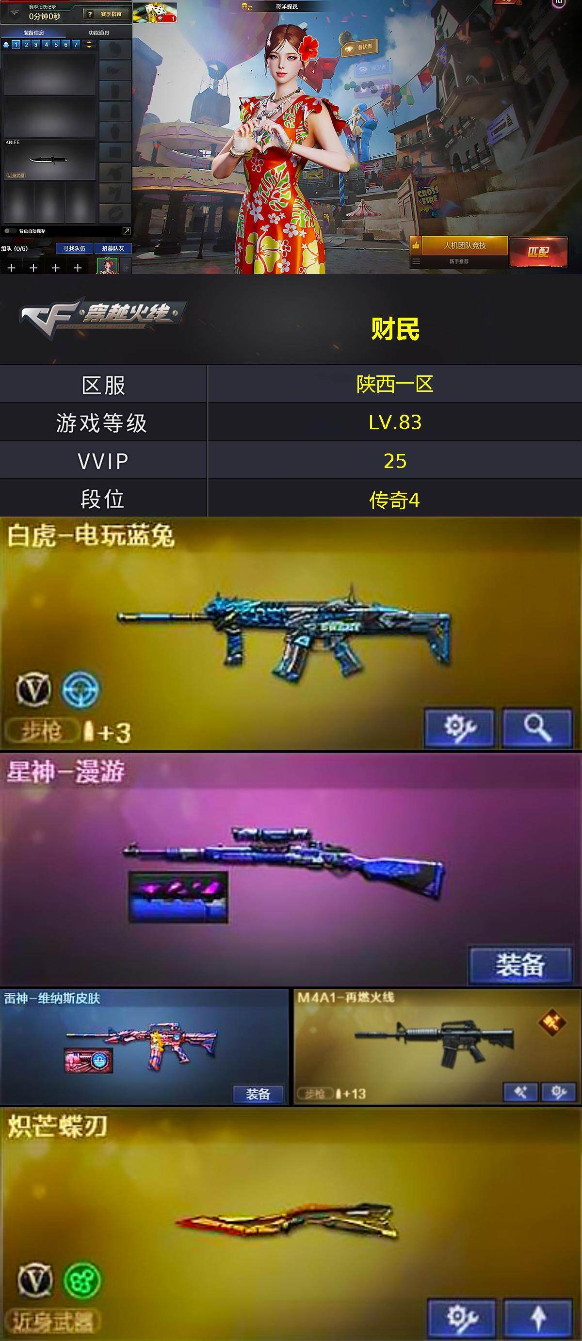[15234686]陕西一区-22V-0王者-1炫金 【热门武器】:白虎-电玩蓝兔,沙鹰-修罗,炽芒蝶刃,金刚伞 【王者炫金武器】:炫金黑龙 【音效卡】:炼狱-百战金芒-庆典舞曲音效卡,沙鹰-修罗-盛典舞曲音效卡,女战神梧桐语音包 【皮肤】:星神-漫游,雷神-维纳斯皮肤,M4A1-再燃火线,火麒麟-大唐荣光,毁灭-暗月,毁灭-黑曼巴 皮肤,毁灭-百城浙江 皮肤,毁灭-虹光风暴 皮肤,毁灭-秦师 皮肤,毁灭-英雄计