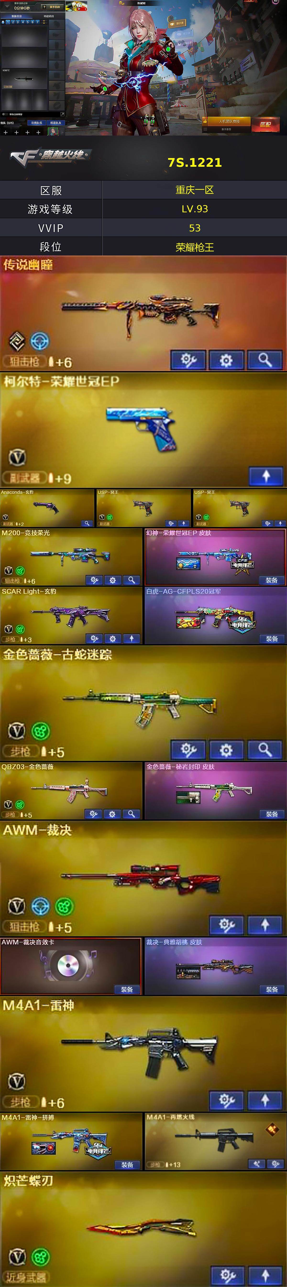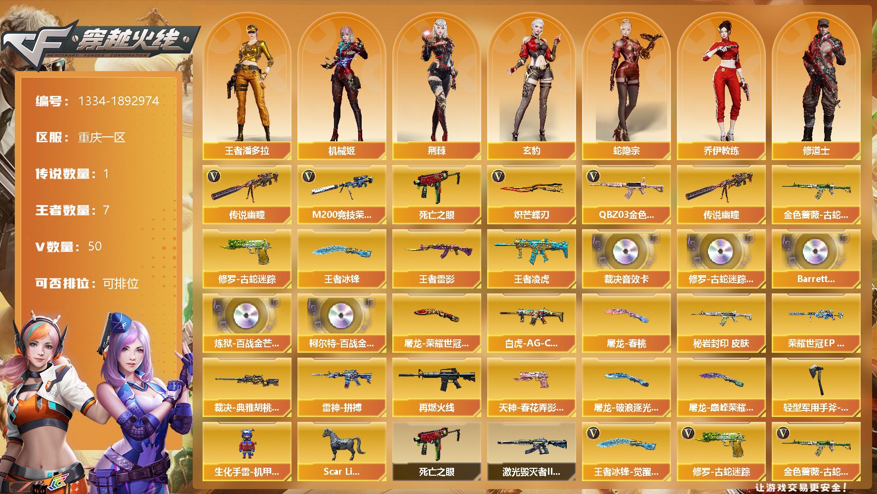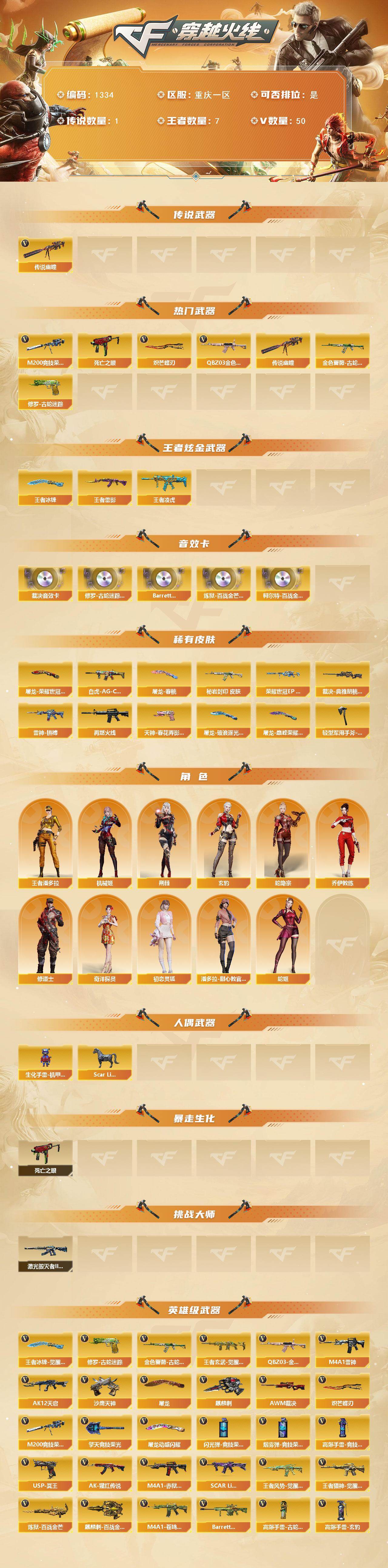 - [14509301]重庆一区-121V-18王者-1炫金 【传说武器】:传说圣谕 【传说角色】:传说星骇 【热门武器】:传说圣谕,HK417-朱雀,M200-幻神,M200-竞技荣光,八面凌龙,死亡之眼,青龙之魄,荣耀世冠-火麒麟,荣耀世冠-雷神*2,白虎-电玩蓝兔,Kar98K-星神,Cat-刀锋,牛牛-AK47,M4A1-黑骑士*3,汤姆逊-烈龙*5,COP-白鲨,USP-雷暴,沙鹰-修罗*3,荣耀世冠-龙啸*2 【王者炫金武器】:青龙之魄,雷霆王者之锋,炫金无影 【音效卡】:修罗-云海游龙音效卡,M4A1-黑龙音效卡,M4A1-黑骑士音效卡,Barrett-极光音效卡,AWM-裁决音效卡,Barrett-碧霄极光音效卡,炼狱-百战金芒-庆典舞曲音效卡 【皮肤】:幻神-丹凤,幻神-电竞之星 皮肤,白虎-大汉风骨,金色蔷薇-电竞之星 皮肤,裁决-胜者为王 皮肤,星神-璀璨皮肤,星神-黯钢战甲 皮肤,雷神-暗月,雷神-R.LGD-CFPLS18冠军,M4A1-再燃火线,雷神-神秘按键 皮肤,毁灭-黑曼巴 皮肤,毁灭-秦师 皮肤,毁灭-英雄计划 皮肤,黑龙-能量核心,黑骑士-暗月,黑骑士-AG-S4冠军典藏,AWM-天龙-传奇白鲨,极光-高能霹雳 皮肤,修罗-能量核心,修罗-冠军之魂,屠龙-春桃 皮肤,轻型军用手斧-再燃火线 【角色】:电竞教官-云悠悠,玄豹,荆棘,王者葵-惊若翩鸿,雪域霜狐,乔伊教练,修道士,云海玲珑,暗夜-X,北极狐-X,芳心审判者,飞虎队-X,风暴女,嘉年华灵狐,娟娟,兰-海滩派对,兰妹妹,灵狐者-X,灵狐者-七夕宝贝,龙儿,麻雀,潘多拉-X,潘多拉-甜心教官,潜龙队-X,青霞仙子,兔囡囡,新娜塔莎,雪莉杨-摸金校尉,夜玫瑰-宠粉,樱-战斗天使,影武者-X 【人偶武器】:COP-白鲨,天龙-曼陀罗,火麒麟-灵狐,M4A1-雷神-精英刀锋,异变清道夫-蛇影双骄,AWM-灵狐-15周年嘉年华*2,Cat-刀锋,牛牛-AK47,迷你裂空之翼*2,迷你牛牛*2,迷你生化手雷,生化手雷-机甲核心,M4A1-斯沃特 【暴走生化】:死亡之眼,超级对讲机 【挑战大师】:神圣爆裂者III*2,冰龙粉碎者-白马银枪,VEPR-12-金魔,激光毁灭者III,机甲撕裂者III,试炼破坏者III,KAC-圣炎切割者III*2,阐释者III,惩戒者III 【英雄级武器】:M4A1-千变,AK