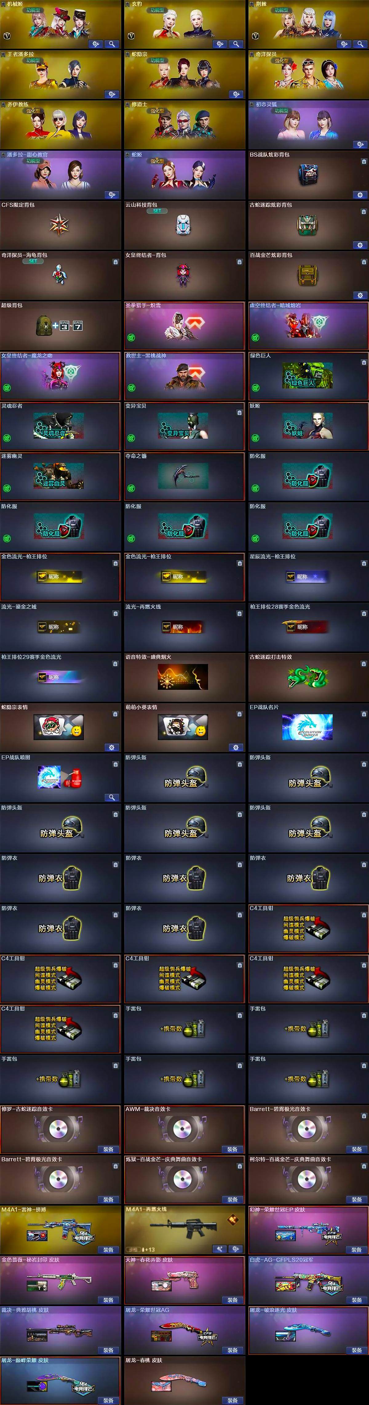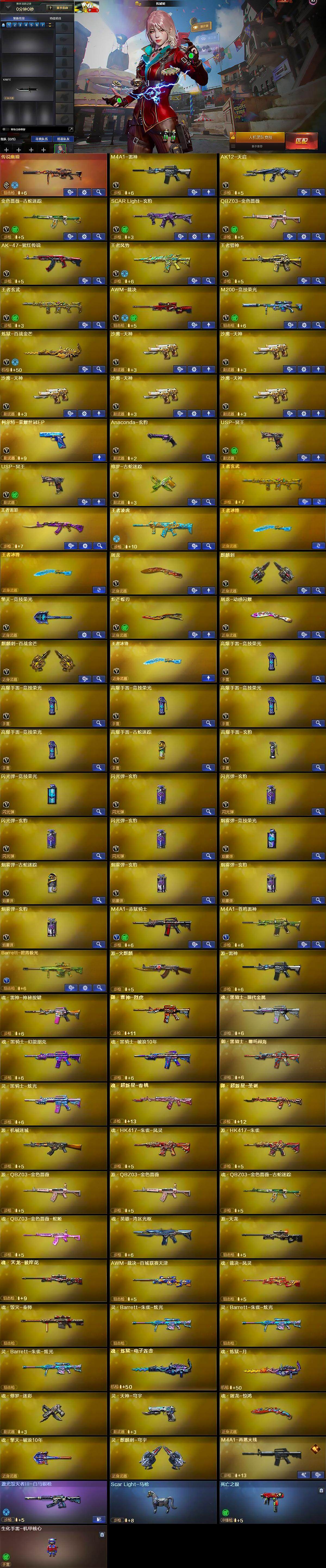- [15349178]四川一区-35V-3王者-2炫金 【热门武器】:QBZ03-金色蔷薇,HK417-朱雀,M200-竞技荣光,M4A1-黑骑士,加特林-炼狱*3 【王者炫金武器】:王者之戮,王者之光,炫金骑士*2 【音效卡】:M4A1-黑骑士音效卡 【皮肤】:M200-幻神-黄忠皮肤,雷神-耀金皮肤,火麒麟-雷神,火麒麟-平天大圣,毁灭-冠军之怒,无影-能量核心,战神-粉色甜心皮肤,战神-流金岁月皮肤,AK47-B-常胜将军-曹操,AK47-B-常胜将军-孙权*2 【角色】:战地猎狐,王者-葵-貂蝉,北极狐-X,初恋灵狐,嘉年华灵狐,娟娟,兰-新年限定,灵狐者-黄金海岸 【人偶武器】:M4A1-雷神-精英刀锋,AWM-灵狐-15周年嘉年华,迷你牛魔王,闪光弹-小乔,闪光弹-貂蝉,高爆手雷-大乔 【挑战大师】:AK47-冰龙粉碎者*2,冰龙粉碎者-白马银枪,激光毁灭者III,神圣爆裂者-末日III 【英雄级武器】:AK47-火麒麟,M4A1-雷神,M4A1-黑骑士,AK47-无影,AK47-黑鲨,HK417-朱雀,QBZ03-金色蔷薇,AK-47-猩红传说*2,黑骑士-海王*2,AK47-B-常胜将军,Barrett-毁灭,Barrett-朱雀,M200-竞技荣光,加特林-炼狱*3,沙鹰-天神,屠龙*2,龙啸*3,麒麟刺,擎天-竞技荣光,王者之啸-觉醒版,高爆手雷-竞技荣光,闪光弹-竞技荣光*2,烟雾弹-竞技荣光*2 【道具】:XROCK炫彩背包,老虎背包,超级背包,救世主-黑桃战神,绿色巨人,灵魂忍者*2,妖姬,迷雾幽灵,生化弹匣,夺命之镰,防化服*2,金色流光-枪王排位*2,星辰流光-枪王排位,巅峰赛先锋-金色流光,枪王排位28赛季金色流光,枪王排位29赛季金色流光,斯沃特表情,防弹头盔*5,防弹衣*5,C4工具钳*4,手雷包*4 【特殊枪械】:1黑骑士,3炼狱