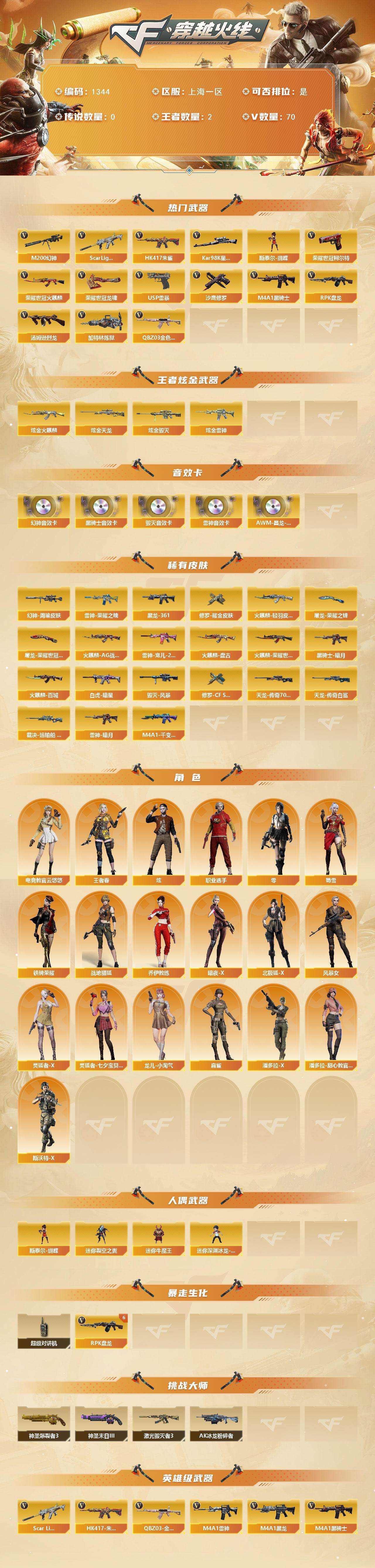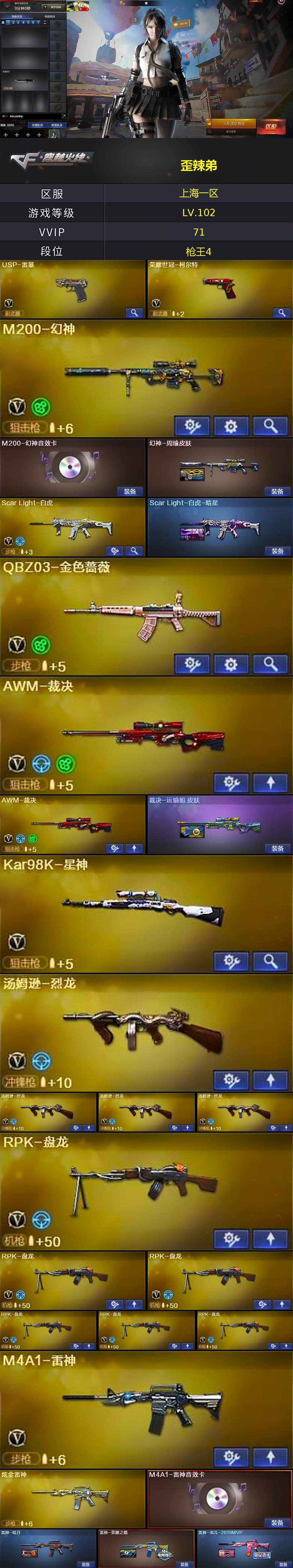 [15234984]上海一区-70V-2王者-4炫金 【热门武器】:QBZ03-金色蔷薇,Scar Light-白虎,HK417-朱雀,M200-幻神,荣耀世冠-火麒麟,荣耀世冠-柯尔特,Kar98K-星神,M4A1-黑骑士*2,汤姆逊-烈龙*4,RPK-盘龙*6,加特林-炼狱,斯泰尔-蝴蝶,USP-雷暴,沙鹰-修罗*6,荣耀世冠-龙啸*2 【王者炫金武器】:炫金火麒麟,炫金雷神,炫金毁灭,炫金天龙 【音效卡】:
