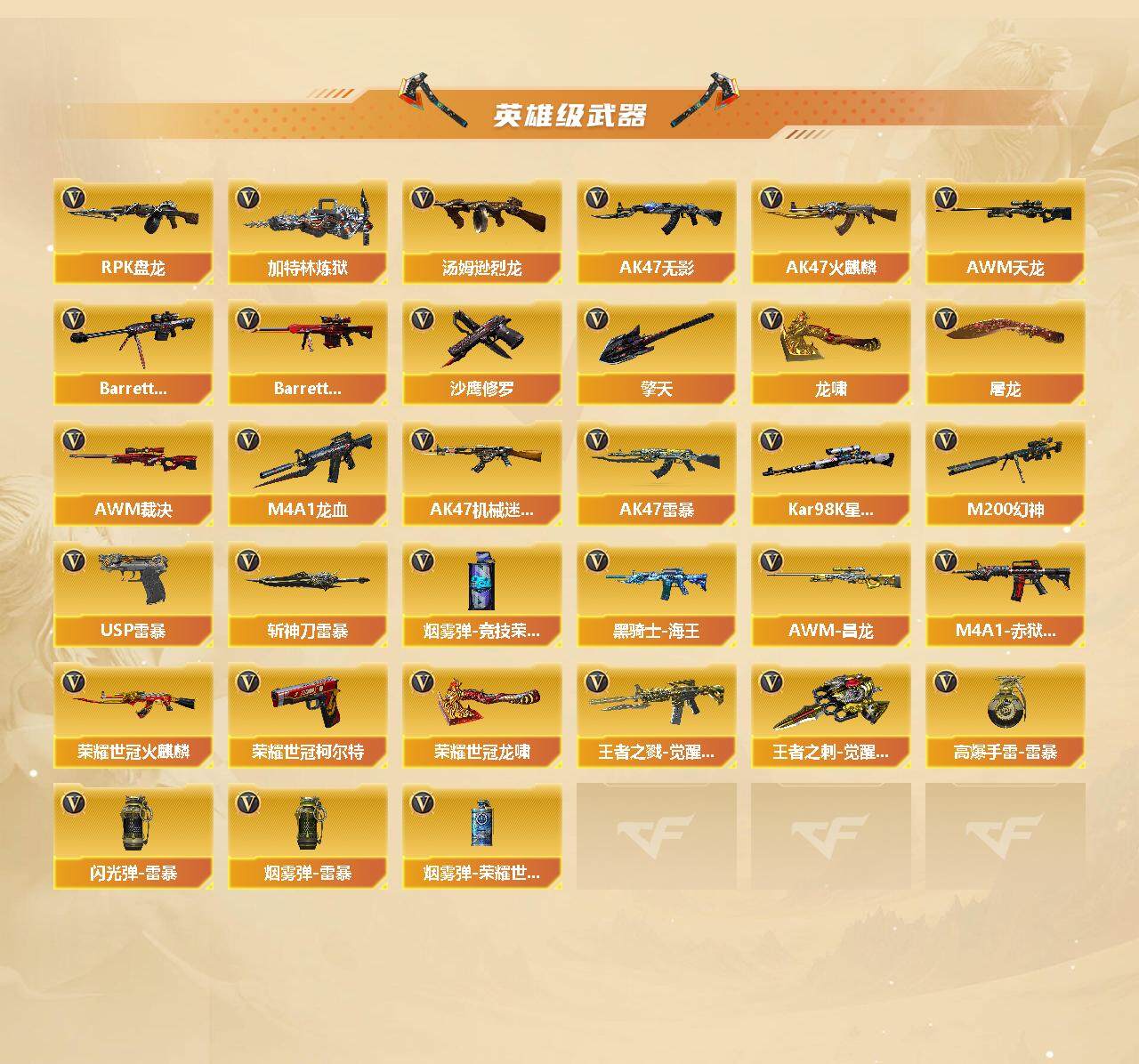 【热门武器】:QBZ03-金色蔷薇,Scar Light-白虎,HK417-朱雀,M200-幻神,荣耀世冠-火麒麟,荣耀世冠-柯尔特,Kar98K-星神,M4A1-黑骑士*2,汤姆逊-烈龙*4,RPK-盘龙*6,加特林-炼狱,斯泰尔-蝴蝶,USP-雷暴,沙鹰-修罗*6,荣耀世冠-龙啸*2