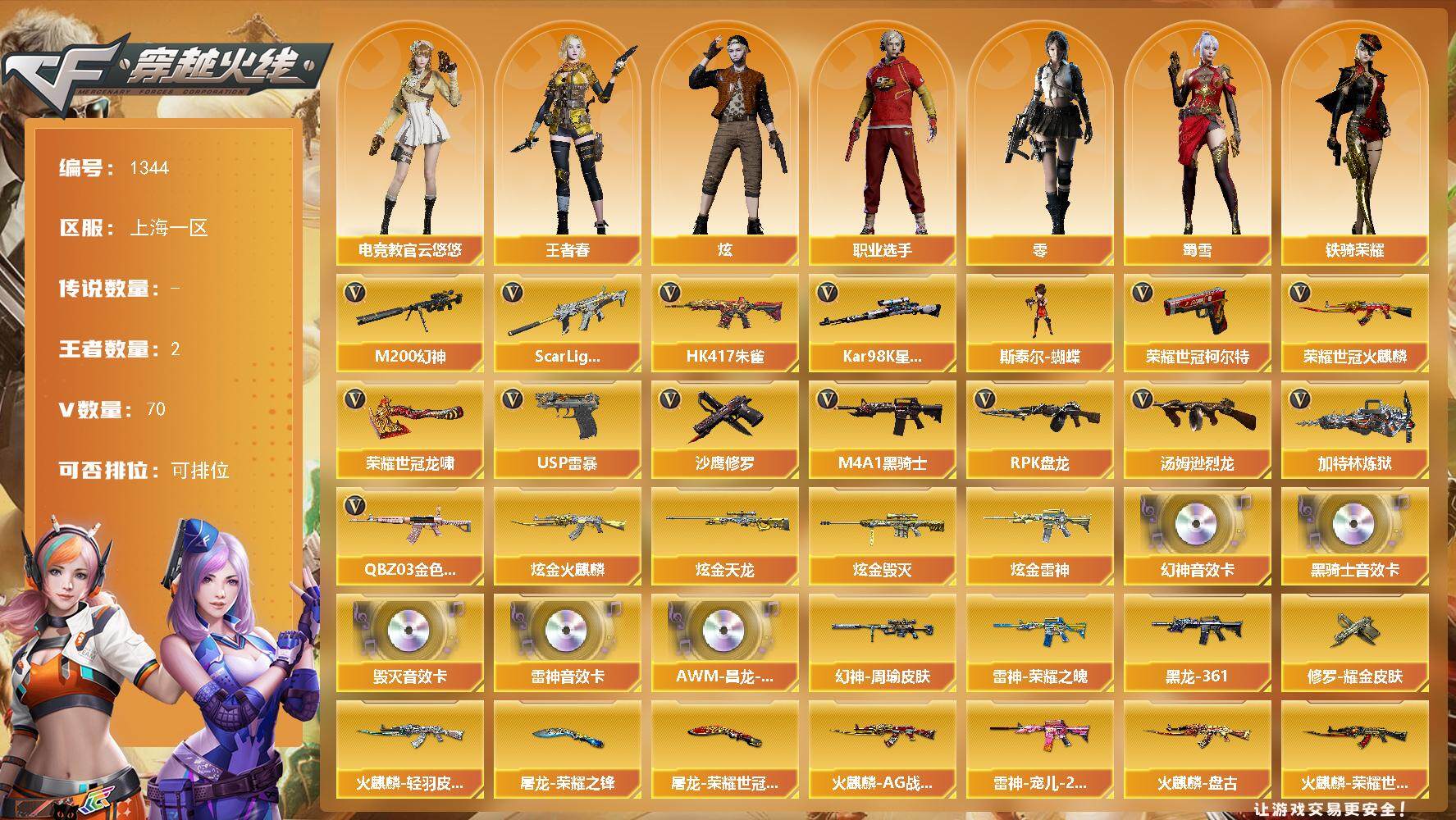 - [14137063]四川一区-42V-4王者-1炫金 【热门武器】:QBZ03-金色蔷薇,M200-幻神,M200-竞技荣光,白虎-电玩蓝兔,Cat-刀锋,M4A1-黑骑士,斯泰尔-蝴蝶,USP-雷暴 【王者炫金武器】:炫金雷神 【音效卡】:擎天-云海游龙音效卡,M4A1-黑骑士音效卡 【皮肤】:幻神-冠军之幻,幻神-巅峰荣耀,裁决-运输船 皮肤,雷神-荣耀之魄,雷神-宇航兔皮肤,M4A1-雷神-新春神龙皮肤,火麒麟-平天大圣,火麒麟-心动糖果,毁灭-荣耀之怒,M4A1-千变-孔明皮肤,战神-流金岁月皮肤*2,AK47-B-常胜将军-曹操*2,AK47-B-常胜将军-刘备,屠龙-荣耀之锋,屠龙-春桃 皮肤,擎天-冠军之击 【角色】:电竞教官-云悠悠,王者-瞳-闭月羞花,王者葵-惊若翩鸿,王者凌霄,乔伊教练,云海玲珑,暗夜-X,初恋灵狐,芳心审判者,娟娟,兰-新年限定,猎狐者-追月,灵狐-花神,龙儿-小淘气,麻雀,潘多拉-X,潘多拉-甜心教官,蜀雪,兔囡囡,夜玫瑰-幻能朋克,樱-战斗天使 【人偶武器】:斯泰尔-蝴蝶,Barrett-云海玲珑,AWM-灵狐-15周年嘉年华,Cat-刀锋,迷你深渊冰龙,生化手雷-机甲核心,迷你超能女侍,灵狐娃娃手雷*2 【暴走生化】:超级对讲机 【挑战大师】:冰龙粉碎者-白马银枪*2,激光毁灭者III-白马银枪*2 【英雄级武器】:AK47-火麒麟*2,M4A1-黑龙,M4A1-雷神,M4A1-黑骑士,AN94-超新星,无影-神兵利器,QBZ03-金色蔷薇,烈火-动感闪耀,白虎-电玩蓝兔,Barrett-毁灭,M200-幻神,M200-竞技荣光,烈龙-云海游龙,USP-雷暴,天神-动感闪耀,修罗-云海游龙,屠龙,擎天,屠龙-动感闪耀,擎天-云海游龙,斩神刀-雷暴,高爆手雷-雷暴*4,高爆手雷-竞技荣光,手雷-动感闪耀,手雷-云海游龙,闪光弹-雷暴*4,闪光弹-竞技荣光,烟雾弹-雷暴*4,烟雾弹-竞技荣光 【道具】:BS战队炫彩背包,XROCK炫彩背包,云山科技背包,云海游龙炫彩背包,炫彩背包,虎牙炫彩背包,超级背包,女皇终结者-魔龙之吻,绿色巨人,灵魂忍者,迷雾幽灵,夺命之镰*2,防化服*4,金色流光-枪王排位*2,枪王排位28赛季金色流光,枪王排位29赛季金色流光,电玩兔兔表情,动感闪耀表情,云海游龙表情,EP战队名片,防弹头盔*6,防弹衣*6,C4工具