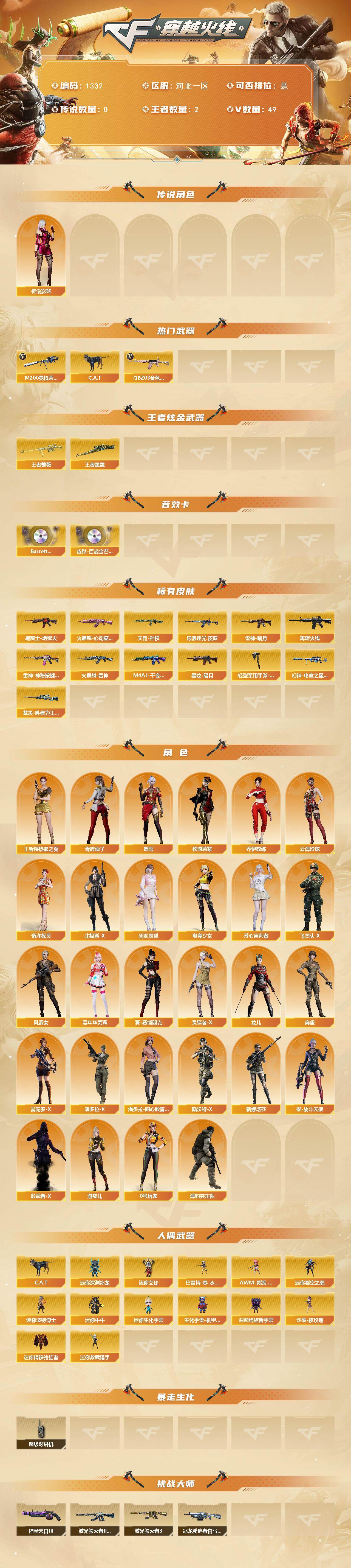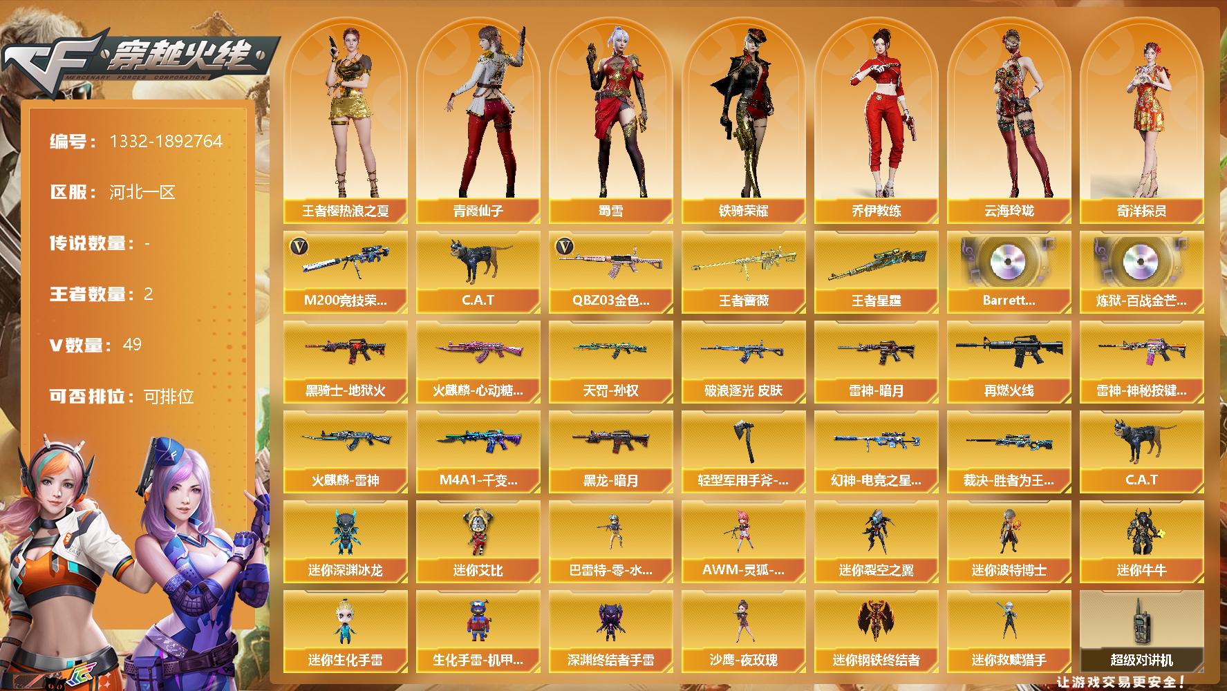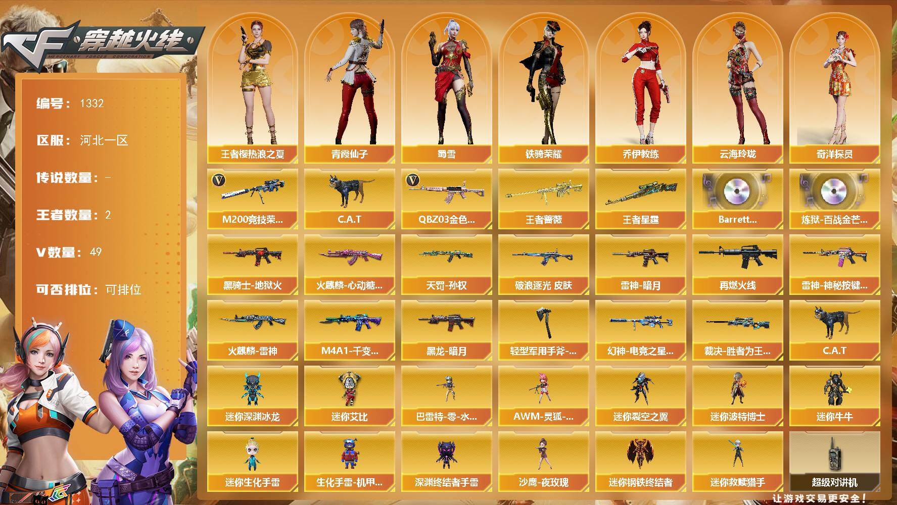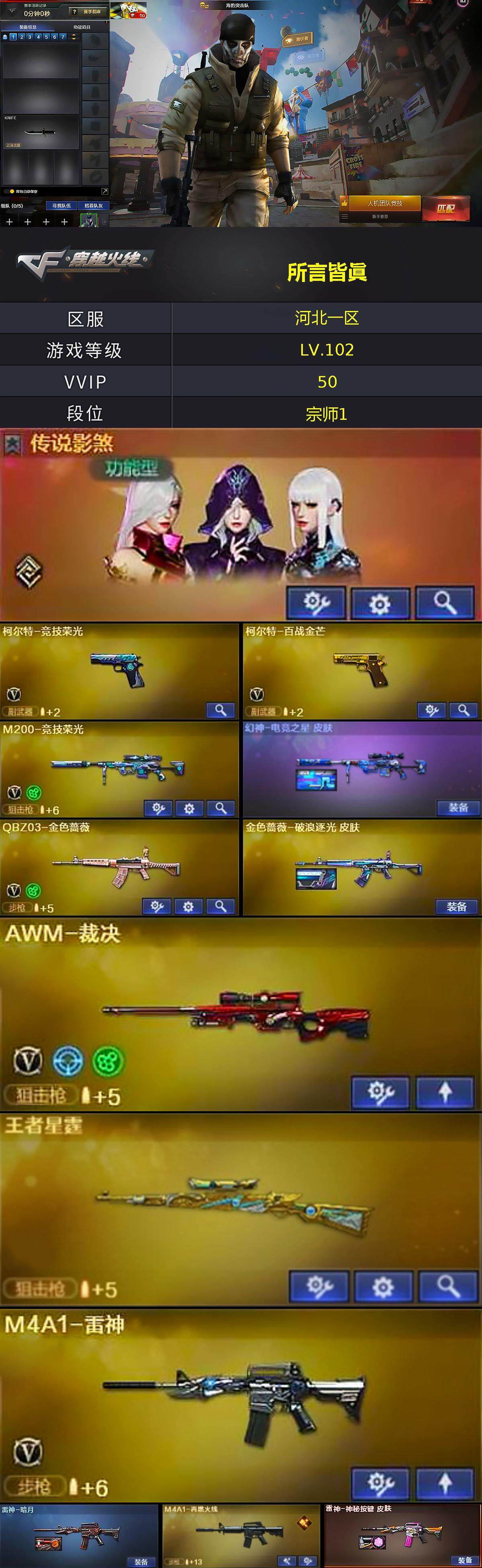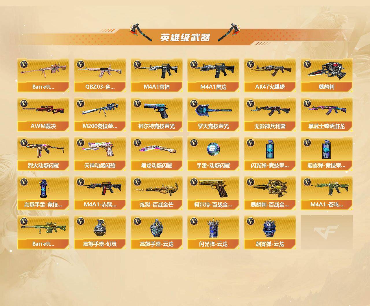 - [13035692]【45】40V/100级/元帅/1炫金/2英雄/QBZ03-金色蔷薇/死亡之眼/火麒麟-荣耀世冠/雷神-荣耀世冠/柯尔特-荣耀世冠/M4A1-黑骑士/汤姆逊-烈龙/RPK-盘龙/加特林-炼狱/沙鹰-修罗/龙啸-荣耀世冠/炫金毁灭/M4A1-雷神音效卡/AWM-裁决音效卡/雷神-虎将/雷神-耀金皮肤/雷神冠军之魄/雷神-荣耀世冠AG/火麒麟-AG战队皮肤/火麒麟-轻羽皮肤/火麒麟-荣耀世冠AG/火麒麟-百城/火麒麟-心动糖果/毁灭耀金皮肤/毁灭-黑大圣皮肤/毁灭-风暴/修罗耀金皮肤/修罗-星空/屠龙-荣耀之锋/屠龙-荣耀世冠AG/葵/魅影/蜀雪/女主播/青霞仙子/火麒麟-灵狐/AWM-灵狐-15周年嘉年华/迷你超能女侍/迷你牛魔王/迷你波特博士/夺魂/迷你火种/生化手雷-机甲核心/神圣爆裂者-末日/阐释者/荣耀世冠-火麒麟/荣耀世冠-柯尔特/荣耀世冠-龙啸/无影-神兵利器/M4A1-雷神/AK47-火麒麟/AK12-天启/AN94-超新星/Barrett-毁灭/Barrett-极光/Barrett-朱雀/AK47-黑鲨/AK-47-猩红传说/麒麟刺/擎天/屠龙