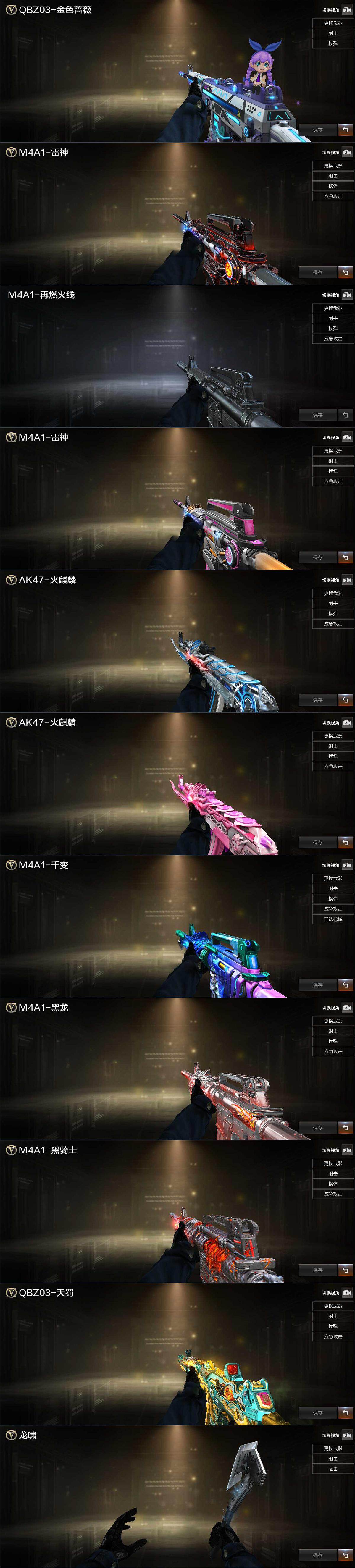 【皮肤】:幻神-电竞之星 皮肤,金色蔷薇-破浪逐光 皮肤,裁决-胜者为王 皮肤,雷神-暗月,M4A1-再燃火线,雷神-神秘按键 皮肤,火麒麟-雷神,火麒麟-
