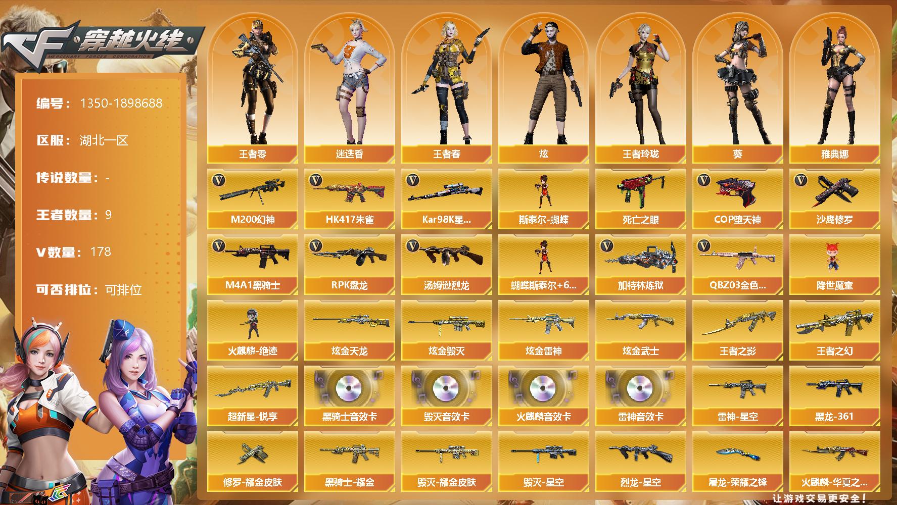 [15235256]湖北一区-178V-9王者-7炫金 【热门武器】:QBZ03-金色蔷薇,HK417-朱雀,M200-幻神*2,死亡之眼,Kar98K-星神,M4A1-黑骑士*3,汤姆逊-烈龙*9,RPK-盘龙*8,加特林-炼狱,斯泰尔-蝴蝶,降世魔童,火麒麟-绝迹,COP-堕天神*3,沙鹰-修罗*5 【王者炫金武器】:超新星-悦享,王者之幻,王者之影,炫金雷神*2,炫金武士,炫金毁灭*3,炫金天龙 【音效卡】
