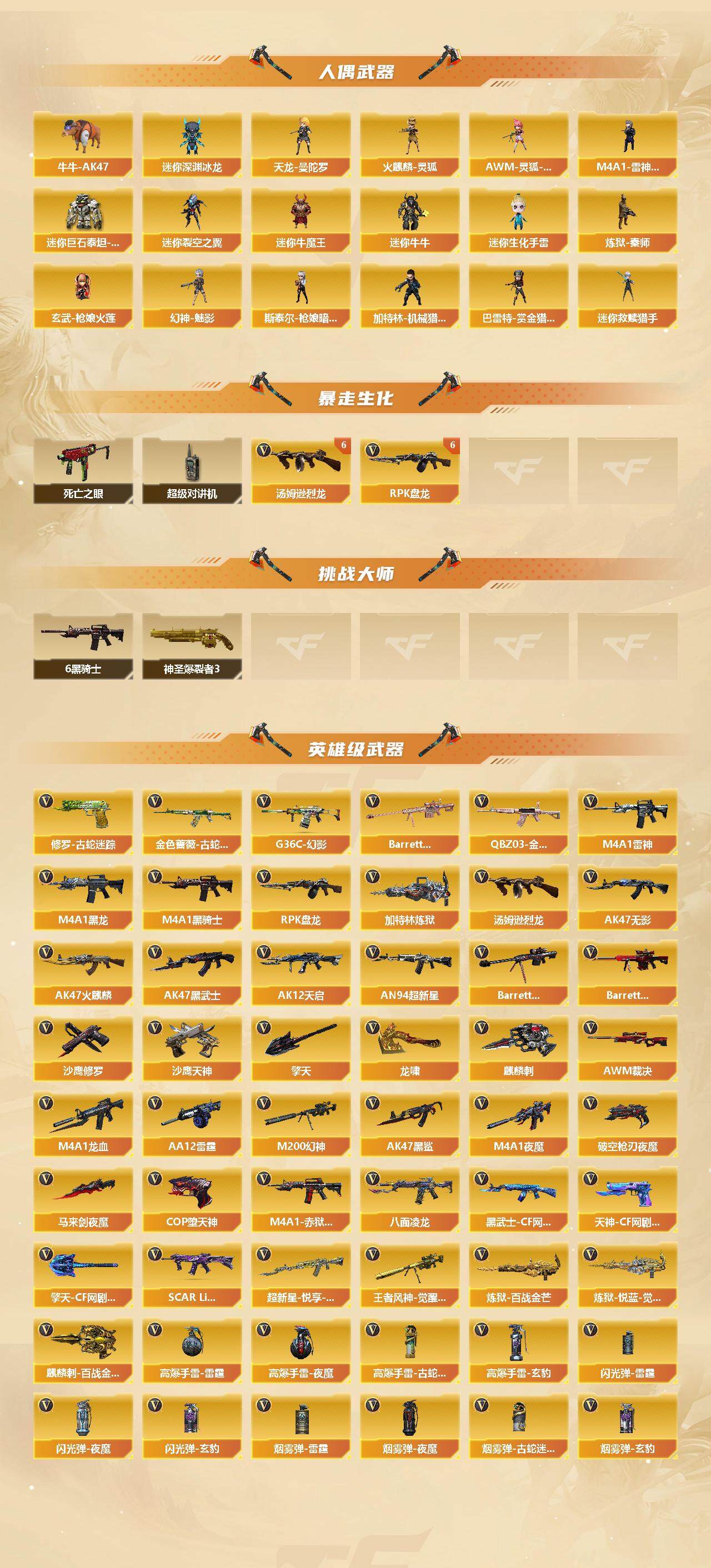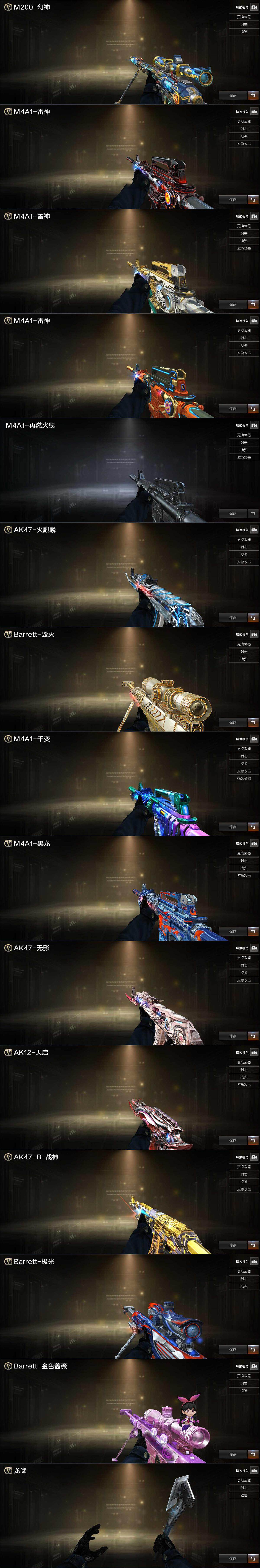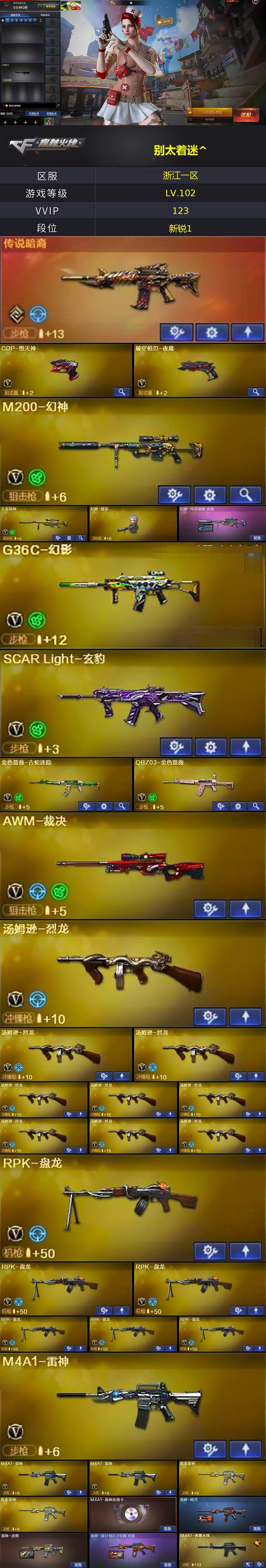 【热门武器】:传说暗裔,G36C-幻影,QBZ03-金色蔷薇,M200-幻神,金色蔷薇-古蛇迷踪,修罗-古蛇迷踪,八面凌龙,死亡之眼*6,金色小号,牛牛-AK47,M4A1-黑骑士*9,汤姆逊-烈龙*9,RPK-盘龙*6,加特林-炼狱,炼狱-秦师,玄武-枪娘火莲,幻神-魅影,COP-堕天神,沙鹰-修罗*3