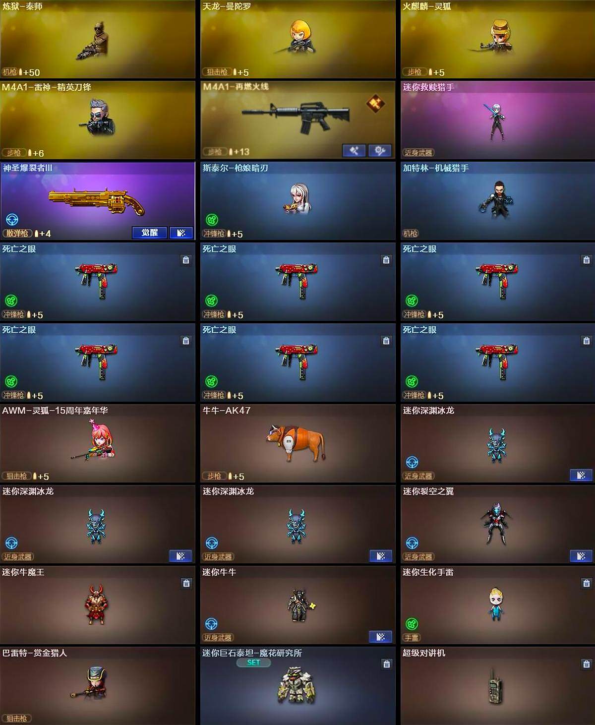 - [15243926]四川一区-23V-1王者-0炫金 【热门武器】:QBZ03-金色蔷薇,M200-幻神,金色蔷薇-古蛇迷踪,修罗-古蛇迷踪,M4A1-黑骑士,加特林-炼狱,沙鹰-修罗 【音效卡】:天神-动感闪耀 音效卡,M4A1-黑骑士音效卡 【皮肤】:雷神-暗月,雷神-传奇N9,雷神-烈虎皮肤,雷神-机甲刑天皮肤,雷神-源计划2.0专属 皮肤,火麒麟-雷神,火麒麟-心动糖果,黑龙-能量核心,天龙-秘银,炼狱-星空 【角色】:蛇隐宗,暗夜-X,芳心审判者,飞虎队-X,嘉年华灵狐,娟娟,兰-新年限定,灵狐者-X,麻雀,曼陀罗-X,潘多拉-X,青霞仙子,蛇姬,斯沃特-X,蜀雪,兔囡囡,雪莉杨-摸金校尉,樱-战斗天使,游珑儿 【人偶武器】:AWM-灵狐-15周年嘉年华,生化手雷-机甲核心,深渊终结者手雷 【暴走生化】:超级对讲机 【挑战大师】:冰龙粉碎者-白马银枪,激光毁灭者III-白马银枪,神圣爆裂者-末日III 【英雄级武器】:AK47-火麒麟,M4A1-雷神*2,M4A1-黑骑士,无影-神兵利器,QBZ03-云龙,黑武士-锦绣游龙,金色蔷薇-古蛇迷踪,QBZ03-金色蔷薇,黑骑士-海王*2,AWM-天龙,Barrett-极光,M200-幻神,加特林-炼狱,沙鹰-修罗,沙鹰-天神,COP 357-雷霆王者-觉醒版,修罗-古蛇迷踪,屠龙*2,幻灵之锋,高爆手雷-幻灵,高爆手雷-古蛇迷踪,闪光弹-幻灵,烟雾弹-幻灵,烟雾弹-古蛇迷踪 【道具】:云山科技背包,全能枪王背包,古蛇迷踪炫彩背包,战舰背包,超级背包,绿色巨人,灵魂忍者,变异宝贝,迷雾幽灵,生化弹匣,夺命之镰,防化服*2,金色流光-枪王排位*2,星辰流光-枪王排位,枪王排位28赛季金色流光,枪王排位29赛季金色流光,古蛇迷踪打击特效,蛇隐宗表情,斯沃特表情,防弹头盔*3,防弹衣*4,C4工具钳*2,手雷包*2 【特殊枪械】:1黑骑士,1炼狱