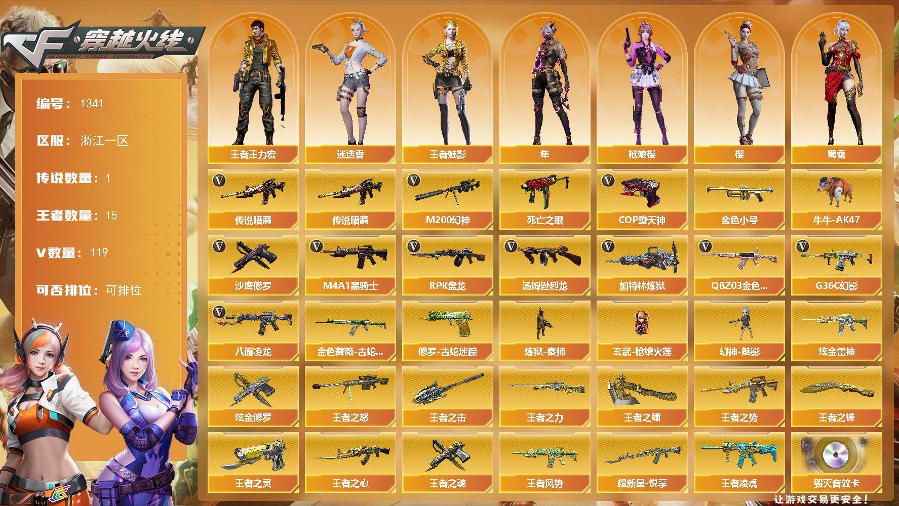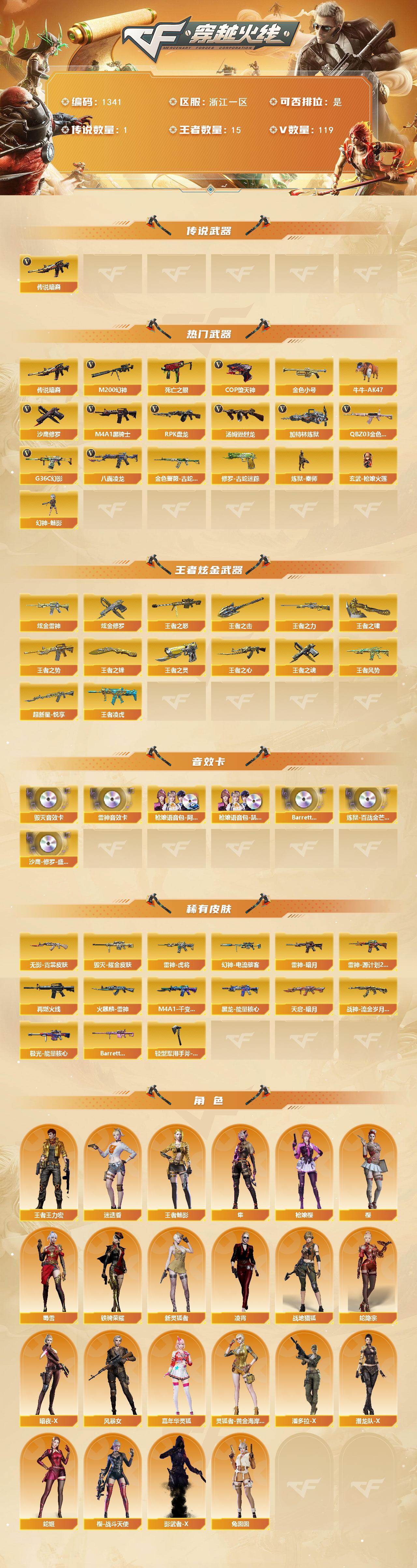 [15237112]浙江一区-119V-15王者-3炫金 【传说武器】:传说暗裔 【热门武器】:传说暗裔,G36C-幻影,QBZ03-金色蔷薇,M200-幻神,金色蔷薇-古蛇迷踪,修罗-古蛇迷踪,八面凌龙,死亡之眼*6,金色小号,牛牛-AK47,M4A1-黑骑士*9,汤姆逊-烈龙*9,RPK-盘龙*6,加特林-炼狱,炼狱-秦师,玄武-枪娘火莲,幻神-魅影,COP-堕天神,沙鹰-修罗*3 【王者炫金武器】:超新星-