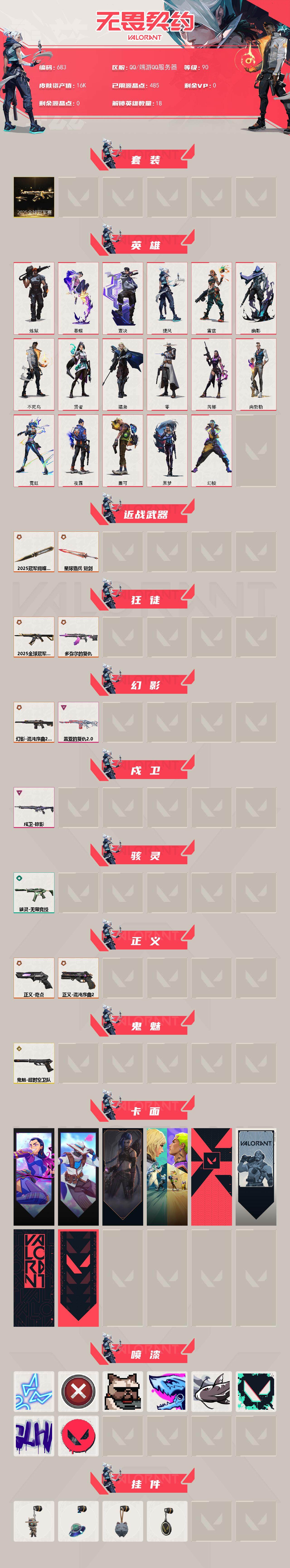 [15239457]【套装】:2025全球冠军赛套装 【英雄】:幻棱,炼狱,暮蝶,壹决,捷风,雷兹,幽影,不死鸟,贤者,猎枭,零,芮娜,尚勃勒,霓虹,夜露,盖可,黑梦 【近战武器】:近战武器-2025全球冠军赛 蝴蝶刀,近战武器-星际猎兵 短剑 【狂徒】:狂徒-2025全球冠军赛,狂徒-多弥尔的复仇 【幻影】:幻影-混沌序曲//2.0,幻影-盖亚的复仇//2.0 【戍卫】:戍卫-掠影 【骇灵】:骇灵-无限竞技 【正义】:正义-奇点,正义-混沌序曲//2.0 【鬼魅】:鬼魅-超时空卫队 【卡面】:无畏契约GO!第一卷:芮娜 卡面,无畏契约GO!第一卷:零 卡面,《双城之战》金克丝 卡面,钢锁vs盖可 卡面,代号红色 卡面,新兵报到 卡面,V契约 卡面,无畏契约 卡面 【喷漆】:霓光四射 喷漆,买装还是存钱 喷漆,关门放狗 喷漆,暴走萝莉 喷漆,松叶 喷漆,胜利属于无畏契约 喷漆,GLHF 喷漆,无畏契约 喷漆 【挂饰】:无畏契约GO!第一卷 零 挂饰,天外飞客 挂饰,《双城之战》魄罗 挂饰,无畏契约 纪念币 挂饰