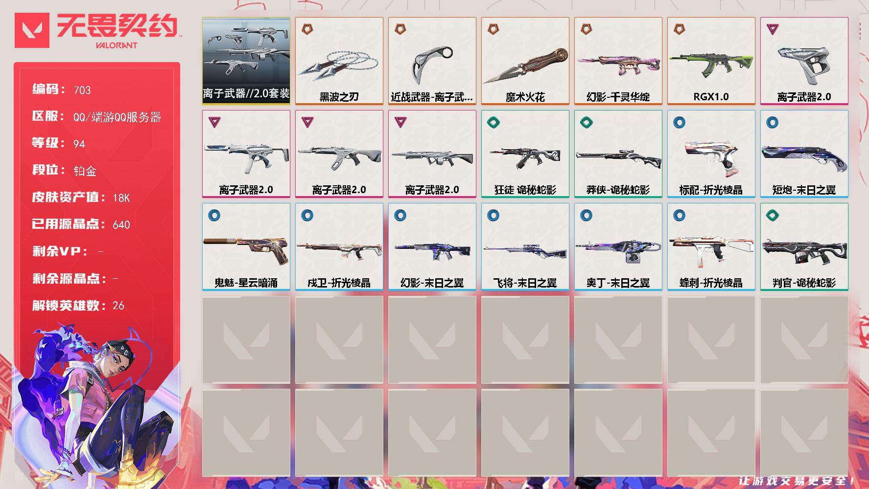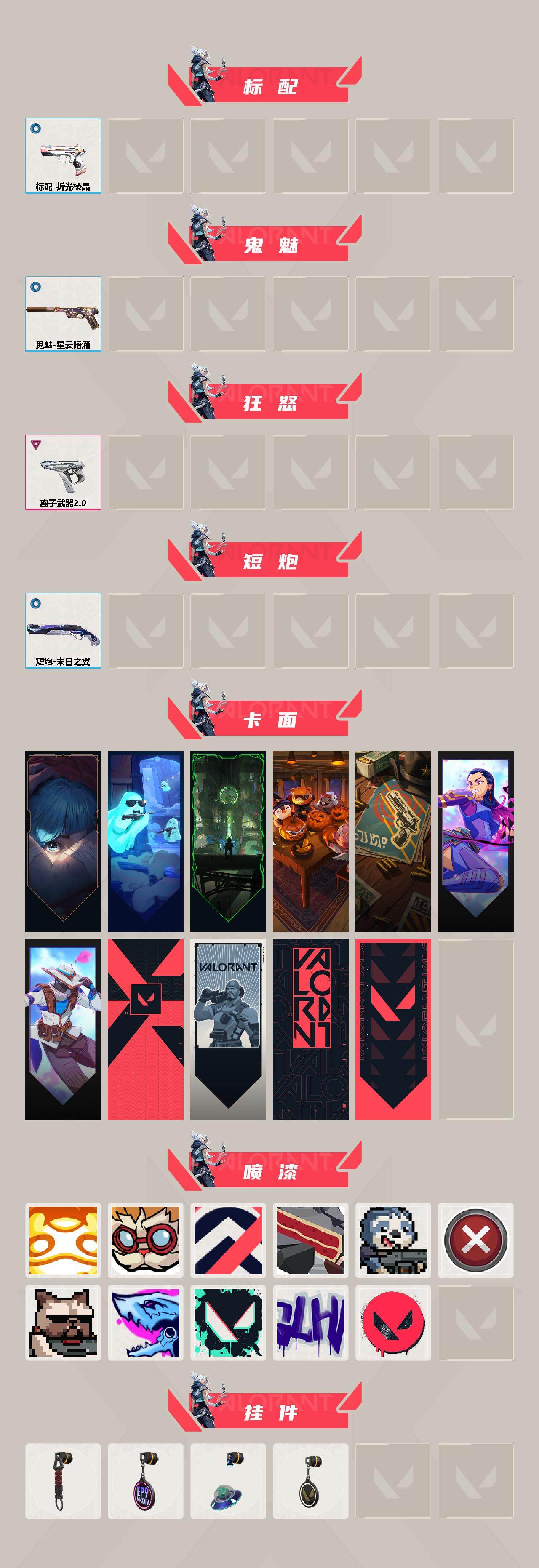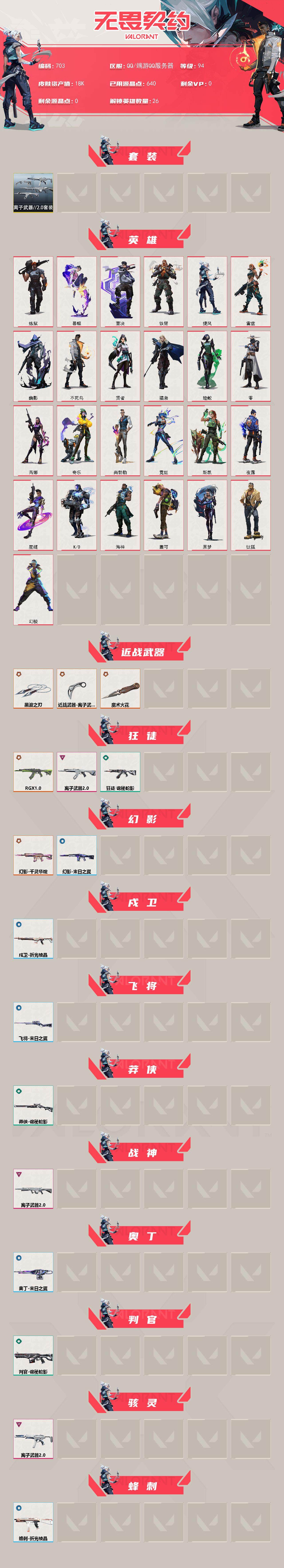 [15239771]【套装】:离子武器//2.0套装 【英雄】:幻棱,炼狱,暮蝶,钛狐,壹决,铁臂,捷风,雷兹,幽影,不死鸟,贤者,猎枭,蝰蛇,零,芮娜,奇乐,尚勃勒,霓虹,斯凯,夜露,星礈,K/O,海神,盖可,黑梦 【近战武器】:近战武器-魔术火花,近战武器-黑波之刃,近战武器-离子武器//2.0 爪刀,近战武器-魔术火花 【狂徒】:狂徒-RGX 11z Pro,狂徒-离子武器//2.0,狂徒-诡秘蛇影 【幻影】:幻影-千灵华绽,幻影-末日之翼 【戍卫】:戍卫-折光棱晶 【飞将】:飞将-末日之翼 【莽侠】:莽侠-诡秘蛇影 【战神】:战神-离子武器//2.0 【奥丁】:奥丁-末日之翼 【判官】:判官-诡秘蛇影 【骇灵】:骇灵-离子武器//2.0 【蜂刺】:蜂刺-折光棱晶 【标配】:标配-折光棱晶 【鬼魅】:鬼魅-星云暗涌 【狂怒】:狂怒-离子武器//2.0 【短炮】:短炮-末日之翼 【卡面】:《双城之战》拥抱 卡面,精灵大战 卡面,欢迎来到底城 卡面,南瓜盛典 卡面,正义的化身 卡面,无畏契约GO!第一卷:芮娜 卡面,无畏契约GO!第一卷:零 卡面,代号红色 卡面,新兵报到 卡面,V契约 卡面,无畏契约 卡面 【喷漆】:嗨宝南瓜灯 喷漆,都算到了 喷漆,控场勿近 喷漆,蛋糕还是爆能器? 喷漆,审判之爪 喷漆,买装还是存钱 喷漆,关门放狗 喷漆,暴走萝莉 喷漆,胜利属于无畏契约 喷漆,GLHF 喷漆,无畏契约 喷漆 【挂饰】:伞绳 挂饰,第九季//第三幕 纪念币 挂饰,天外飞客 挂饰,无畏契约 纪念币 挂饰