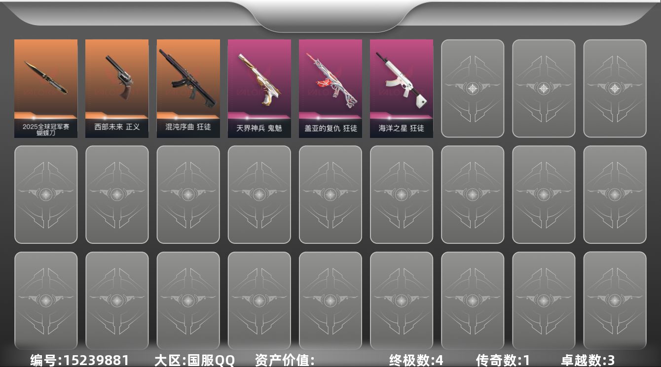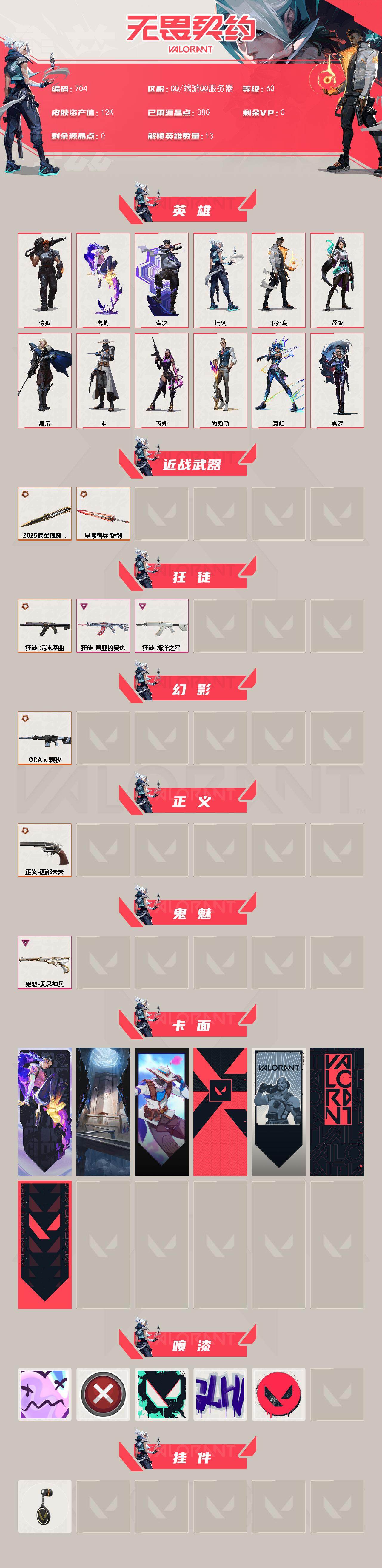 [15239881]【英雄】:炼狱,暮蝶,壹决,捷风,不死鸟,贤者,猎枭,零,芮娜,尚勃勒,霓虹,黑梦 【近战武器】:近战武器-2025全球冠军赛 蝴蝶刀,近战武器-星际猎兵 短剑 【狂徒】:狂徒-混沌序曲,狂徒-盖亚的复仇,狂徒-海洋之星 【幻影】:幻影-ORA x 颗秒 【正义】:正义-西部未来 【鬼魅】:鬼魅-天界神兵 【卡面】:无畏契约:暮蝶 卡面,表象之下 卡面,无畏契约GO!第一卷:零 卡面,代号红色 卡面,新兵报到 卡面,V契约 卡面,无畏契约 卡面 【喷漆】:伤心心 喷漆,买装还是存钱 喷漆,胜利属于无畏契约 喷漆,GLHF 喷漆,无畏契约 喷漆 【挂饰】:无畏契约 纪念币 挂饰