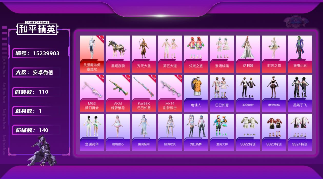 [15239903]【暑期末清货/特价急出/永久包赔】:安卓 微信-1红装-7粉装-4特效枪-1载具-46828热力值-3印记-110套装-140枪皮【角色神装等级】:灵猫魔法师-塞维尔(二级)【稀有载具】:黑曜夜骑【特效枪等级】:AKM-绿萝繁花(五级),Kar98K-巳巳如意(五级),MG3-梦幻舞会(七级),MG3-辉羽雀灵(五级Mk14-甜梦熊击)【优质套装】:粉装-齐天大圣,粉装-第五大道,粉装-炫光之旅,粉装-蜜语绒猫,角色-萨利娅,角色-时光之吻,角色-狂魇小丑【优质飞行器】:齐天大圣飞行器,时光之吻飞行器,灵猫魔法师飞行器