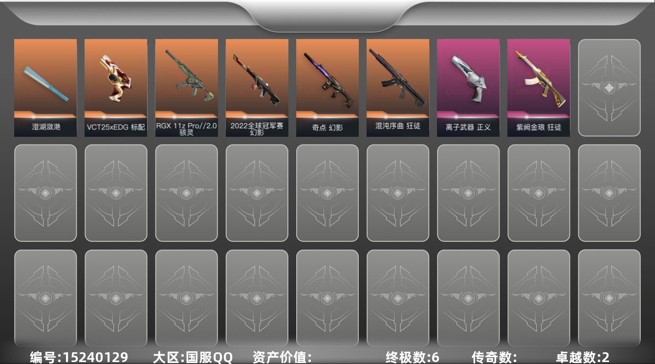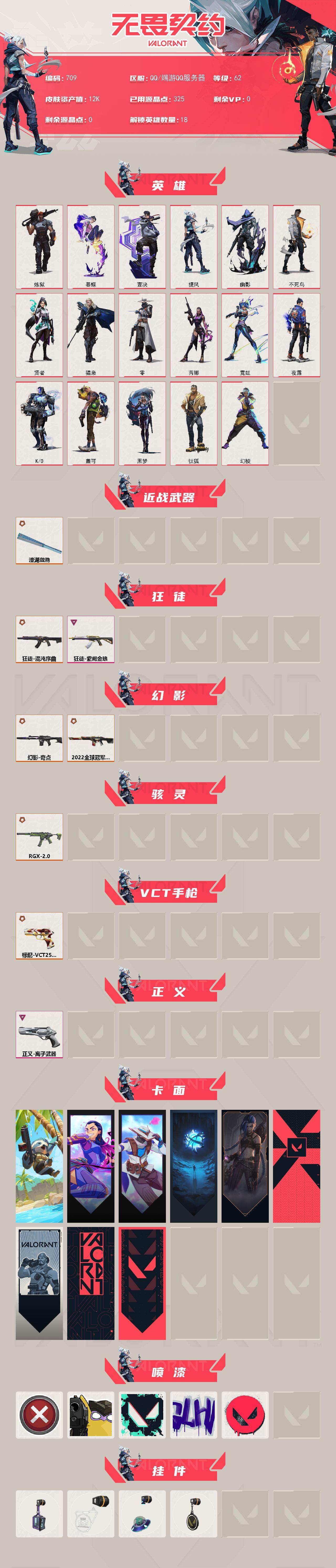 [15240129]【英雄】:幻棱,炼狱,暮蝶,钛狐,壹决,捷风,幽影,不死鸟,贤者,猎枭,零,芮娜,霓虹,夜露,K/O,盖可,黑梦 【近战武器】:近战武器-澄湖潋滟 【狂徒】:狂徒-混沌序曲,狂徒-紫阙金琅 【幻影】:幻影-2022全球冠军赛,幻影-奇点 【骇灵】:骇灵-RGX 11z Pro//2.0 【VCT手枪】:标配-VCT25 x EDG 【正义】:正义-离子武器 【卡面】:树懒大作战 卡面,无畏契约GO!第一卷:芮娜 卡面,无畏契约GO!第一卷:零 卡面,无垠星环 卡面,《双城之战》金克丝 卡面,代号红色 卡面,新兵报到 卡面,V契约 卡面,无畏契约 卡面 【喷漆】:买装还是存钱 喷漆,放下武器 喷漆,胜利属于无畏契约 喷漆,GLHF 喷漆,无畏契约 喷漆 【挂饰】:动力机箱 挂饰,VCT x EDG 挂饰,天外飞客 挂饰,无畏契约 纪念币 挂饰