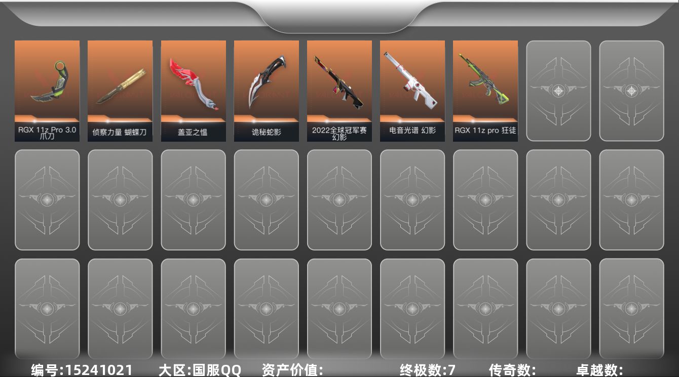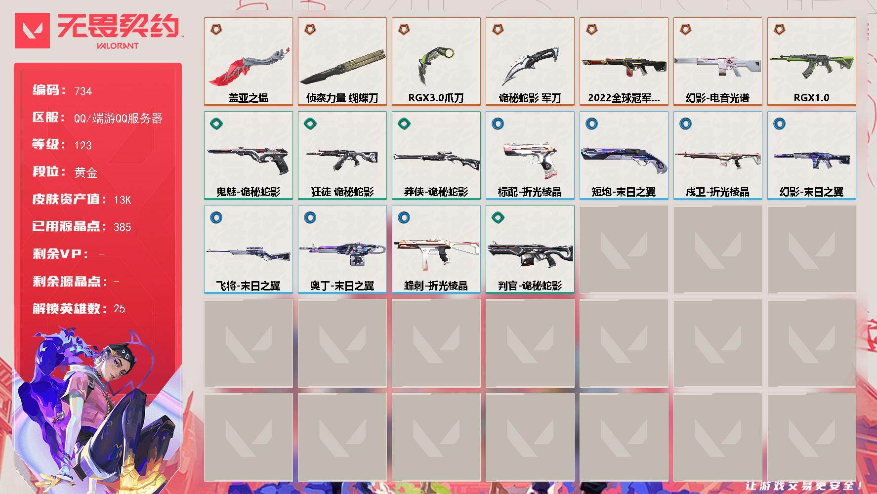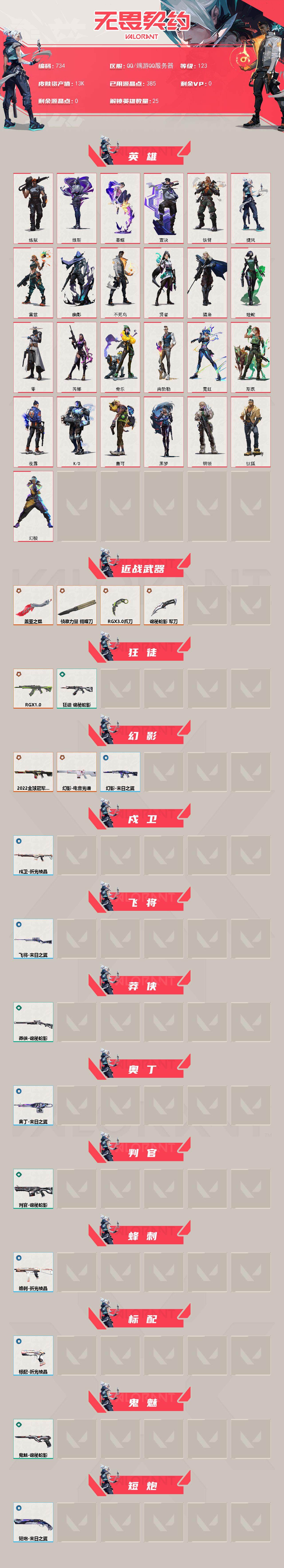 [15241021]【英雄】:幻棱,炼狱,维斯,暮蝶,钛狐,壹决,铁臂,捷风,雷兹,幽影,不死鸟,贤者,猎枭,蝰蛇,零,芮娜,奇乐,尚勃勒,霓虹,斯凯,夜露,K/O,盖可,黑梦,钢锁 【近战武器】:近战武器-侦察力量 蝴蝶刀,近战武器-RGX 11z Pro//3.0 爪刀,近战武器-盖亚之愠,近战武器-诡秘蛇影 军刀 【狂徒】:狂徒-RGX 11z Pro,狂徒-诡秘蛇影 【幻影】:幻影-2022全球冠军赛,幻影-电音光谱,幻影-末日之翼,幻影-电音光谱 【戍卫】:戍卫-折光棱晶 【飞将】:飞将-末日之翼 【莽侠】:莽侠-诡秘蛇影 【奥丁】:奥丁-末日之翼 【判官】:判官-诡秘蛇影 【蜂刺】:蜂刺-折光棱晶 【标配】:标配-折光棱晶 【鬼魅】:鬼魅-诡秘蛇影 【短炮】:短炮-末日之翼 【卡面】:南瓜盛典 卡面,正义的化身 卡面,树懒大作战 卡面,无畏契约GO!第一卷:芮娜 卡面,清除名单 卡面,无畏契约GO!第一卷:零 卡面,代号红色 卡面,新兵报到 卡面,V契约 卡面,无畏契约 卡面 【喷漆】:控场勿近 喷漆,买装还是存钱 喷漆,胜利属于无畏契约 喷漆,GLHF 喷漆,无畏契约 喷漆 【挂饰】:第九季//第三幕 纪念币 挂饰,第九季//第二幕 纪念币 挂饰,天外飞客 挂饰,无畏契约 纪念币 挂饰