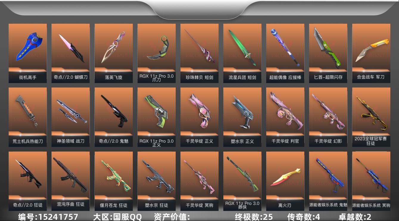 [15241757]【套装】:离火刃套装,源能者娱乐系统套装,RGX 11z Pro//3.0套装,离火刃套装,千灵华绽套装,奇点//2.0套装 【英雄】:幻棱,炼狱,维斯,暮蝶,钛狐,壹决,铁臂,捷风,雷兹,幽影,不死鸟,贤者,猎枭,蝰蛇,零,芮娜,奇乐,尚勃勒,霓虹,斯凯,夜露,星礈,K/O,海神,盖可,黑梦,钢锁 【近战武器】:近战武器-奇点//2.0 蝴蝶刀,近战武器-RGX 11z Pro//3.0 爪刀,近战武器-离火刃,近战武器-落英飞旋,近战武器-珍珠棘贝 短剑,近战武器-流星兵团 短剑,近战武器-超能偶像 应援棒,近战武器-超限闪存 匕首,近战武器-合金战车 军刀,近战武器-荒土机兵 热能刀,近战武器-街机高手,近战武器-神圣领域 战刀 【狂徒】:狂徒-2023全球冠军赛,狂徒-混沌序曲,狂徒-奇点//2.0,狂徒-塑水宗,狂徒-偃月苍龙,狂徒-掠影,狂徒-海洋之星,狂徒-超能偶像,狂徒-荒土机兵,狂徒-流星兵团 【幻影】:幻影-源能者娱乐系统,幻影-千灵华绽,幻影-超限闪存,幻影-合金战车,幻影-珍珠棘贝,幻影-神圣领域,幻影-聚合之力,幻影-纳米打击 【戍卫】:戍卫-超能偶像,戍卫-珍珠棘贝,戍卫-浮光跃金,戍卫-花漾粉红,戍卫-逆冲蛮牛,戍卫-战术熊与伙伴们,戍卫-月球哨兵 【獠犬】:獠犬-源能者娱乐系统,獠犬-神圣领域,獠犬-采蜜小蜂队,獠犬-复古浪潮,獠犬-模拟赫兹,獠犬-逆冲蛮牛,獠犬-数码咒术 【冥驹】:冥驹-源能者娱乐系统,冥驹-千灵华绽,冥驹-荒土机兵,冥驹-复古浪潮,冥驹-花漾粉红,冥驹-模拟赫兹,冥驹-星云暗涌 【飞将】:飞将-合金战车,飞将-聚合之力,飞将-战术熊与伙伴们 【莽侠】:莽侠-RGX 11z Pro//3.0,莽侠-超限闪存,莽侠-深海水族,莽侠-纤云弄巧,莽侠-月球哨兵 【战神】:战神-神圣领域,战神-采蜜小蜂队,战神-浮光跃金,战神-深海水族,战神-数码咒术 【奥丁】:奥丁-流星兵团,奥丁-纳米打击 【判官】:判官-千灵华绽,判官-超能偶像,判官-采蜜小蜂队,判官-纳米打击x,判官-数码咒术 【雄鹿】:雄鹿-复古浪潮,雄鹿-模拟赫兹,雄鹿-逆冲蛮牛,雄鹿-月球哨兵 【骇灵】:骇灵-荒土机兵,骇灵-流星兵团,骇灵-珍珠棘贝,骇灵-浮光跃金,骇灵-花漾粉红,骇灵-星云暗涌 【蜂刺】:蜂刺-超限闪存,蜂刺-合金战车,蜂刺-聚合之力,