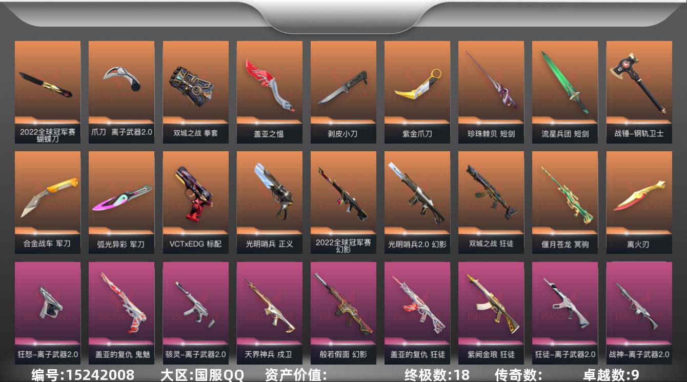[15242008]【套装】:离火刃套装,2022全球冠军赛套装,离火刃套装,《双城之战》收藏套装,VCTxEDG 队伍套装,离子武器//2.0套装,无畏启程套装 【英雄】:幻棱,炼狱,维斯,暮蝶,钛狐,壹决,铁臂,捷风,雷兹,幽影,不死鸟,贤者,猎枭,蝰蛇,零,芮娜,奇乐,尚勃勒,霓虹,斯凯,夜露,星礈,K/O,海神,盖可,黑梦,钢锁 【近战武器】:近战武器-2022全球冠军赛 蝴蝶刀,近战武器-剥皮小刀,近战武器-紫金爪刀,近战武器-离火刃,近战武器-离子武器//2.0 爪刀,近战武器-双城之战 拳套,近战武器-珍珠棘贝 短剑,近战武器-流星兵团 短剑,近战武器-盖亚之愠,近战武器-钢轨卫士 战锤,近战武器-合金战车 军刀,近战武器-弧光异彩 军刀 【狂徒】:狂徒-双城之战,狂徒-盖亚的复仇,狂徒-紫阙金琅,狂徒-离子武器//2.0,狂徒-钢轨卫士,狂徒-弧光异彩,狂徒-流星兵团 【幻影】:幻影-2022全球冠军赛,幻影-光明哨兵//2.0,幻影-般若假面,幻影-合金战车,幻影-噬源兽防卫工程,幻影-珍珠棘贝,幻影-战术小伙伴 【戍卫】:戍卫-天界神兵,戍卫-钢轨卫士,戍卫-珍珠棘贝,戍卫-彩梦之城,戍卫-花漾粉红,戍卫-战术熊与伙伴们 【獠犬】:獠犬-弧光异彩,獠犬-复古浪潮,獠犬-数码咒术,獠犬-战术小伙伴 【冥驹】:冥驹-偃月苍龙,冥驹-白日幻梦,冥驹-复古浪潮,冥驹-花漾粉红 【飞将】:飞将-合金战车,飞将-信手涂鸦,飞将-光导纤维,飞将-战术熊与伙伴们 【莽侠】:莽侠-深海水族,莽侠-纤云弄巧 【战神】:战神-离子武器//2.0,战神-深海水族,战神-数码咒术 【奥丁】:奥丁-流星兵团,奥丁-信手涂鸦,奥丁-战术小伙伴 【判官】:判官-数码咒术 【雄鹿】:雄鹿-彩梦之城,雄鹿-复古浪潮 【骇灵】:骇灵-离子武器//2.0,骇灵-流星兵团,骇灵-珍珠棘贝,骇灵-光导纤维,骇灵-花漾粉红,骇灵-信手涂鸦 【蜂刺】:蜂刺-合金战车,蜂刺-弧光异彩,蜂刺-深海水族,蜂刺-纤云弄巧,蜂刺-战术小伙伴 【标配】:标配-超能偶像,标配-彩梦之城,标配-超能冲撞,标配-光导纤维,标配-战术熊与伙伴们 【VCT手枪】:标配-VCT x EDG 【正义】:正义-光明哨兵,正义-合金战车,正义-复古浪潮,正义-纤云弄巧 【鬼魅】:鬼魅-盖亚的复仇,鬼魅-流星兵团,鬼魅-光导纤维,鬼魅-数码咒