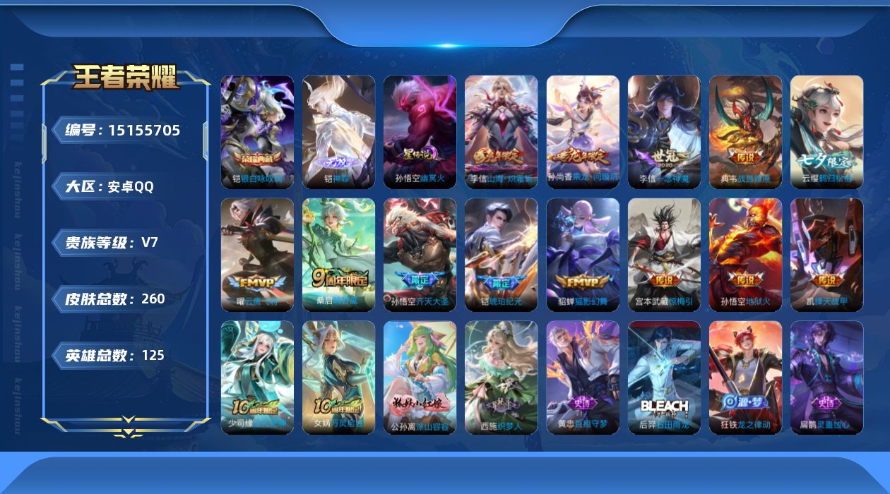 [15155705]【店主推荐捡漏号!可直接换绑】安卓Q-V7-最强王者段位-125英雄-260皮肤-1典藏-1星传说-1无双-14传说-77史诗