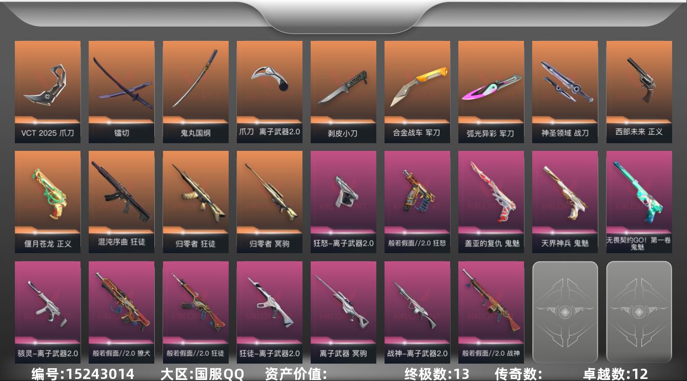 [15243014]【套装】:VCT 2025 赛季套装,般若假面//2.0套装,离子武器//2.0套装 【英雄】:幻棱,炼狱,暮蝶,钛狐,壹决,铁臂,捷风,幽影,不死鸟,贤者,猎枭,蝰蛇,零,芮娜,奇乐,尚勃勒,盖可,钢锁 【近战武器】:近战武器-剥皮小刀,近战武器-VCT 2025 爪刀,近战武器-镭切,近战武器-鬼丸国纲,近战武器-离子武器//2.0 爪刀,近战武器-合金战车 军刀,近战武器-弧光异彩 军刀,近战武器-神圣领域 战刀 【狂徒】:狂徒-归零者,狂徒-混沌序曲,狂徒-般若假面//2.0,狂徒-离子武器//2.0,狂徒-弧光异彩,狂徒-沙尘幻旅,狂徒-诡秘蛇影 【幻影】:幻影-合金战车,幻影-噬源兽防卫工程,幻影-神圣领域 【戍卫】:戍卫-彩梦之城,戍卫-花漾粉红,戍卫-萌彩剪影,戍卫-月球哨兵,戍卫-折光棱晶 【獠犬】:獠犬-般若假面//2.0,獠犬-弧光异彩,獠犬-神圣领域,獠犬-胡桃狂想,獠犬-数码咒术 【冥驹】:冥驹-归零者,冥驹-离子武器,冥驹-胡桃狂想,冥驹-花漾粉红,冥驹-星云暗涌 【飞将】:飞将-合金战车,飞将-沙尘幻旅,飞将-信手涂鸦,飞将-末日之翼 【莽侠】:莽侠-诡秘蛇影,莽侠-月球哨兵 【战神】:战神-般若假面//2.0,战神-离子武器//2.0,战神-神圣领域,战神-萌彩剪影,战神-数码咒术 【奥丁】:奥丁-信手涂鸦,奥丁-末日之翼 【判官】:判官-诡秘蛇影,判官-萌彩剪影,判官-数码咒术 【雄鹿】:雄鹿-彩梦之城,雄鹿-月球哨兵 【骇灵】:骇灵-离子武器//2.0,骇灵-沙尘幻旅,骇灵-花漾粉红,骇灵-信手涂鸦,骇灵-星云暗涌 【蜂刺】:蜂刺-合金战车,蜂刺-弧光异彩,蜂刺-胡桃狂想,蜂刺-星云暗涌,蜂刺-折光棱晶 【标配】:标配-彩梦之城,标配-折光棱晶 【正义】:正义-偃月苍龙,正义-西部未来,正义-合金战车,正义-月球哨兵 【鬼魅】:鬼魅-盖亚的复仇,鬼魅-天界神兵,鬼魅-无畏契约GO!第一卷,鬼魅-光导纤维,鬼魅-胡桃狂想,鬼魅-数码咒术,鬼魅-信手涂鸦,鬼魅-星云暗涌 【狂怒】:狂怒-般若假面//2.0,狂怒-离子武器//2.0,狂怒-神圣领域,狂怒-花漾粉红,狂怒-萌彩剪影 【短炮】:短炮-弧光异彩,短炮-末日之翼 【卡面】:《双城之战》拥抱 卡面,精灵大战 卡面,欢迎来到底城 卡面,南瓜盛典 卡面,正义的化身 卡面,声感陷阱设