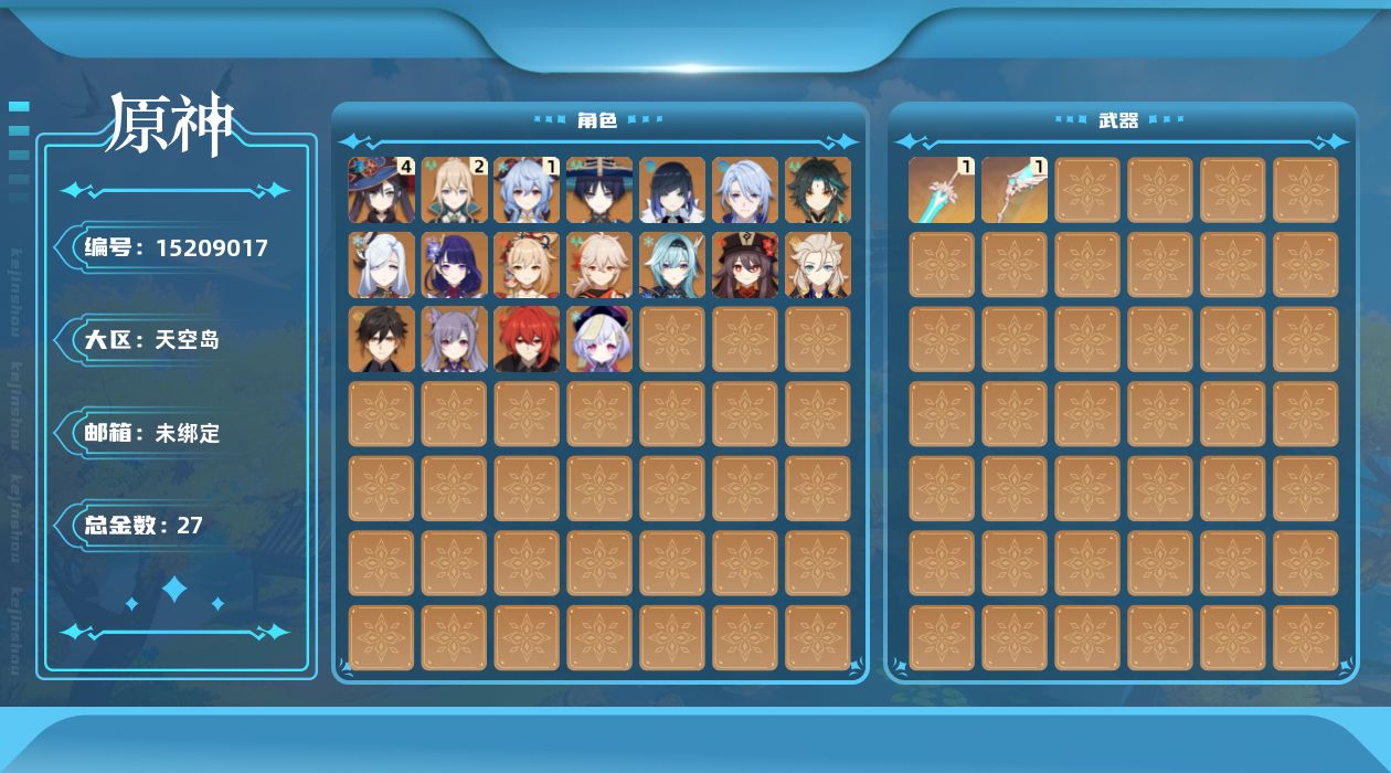 0命流浪者,0命夜兰,0命神里绫人,0命申鹤,0命优菈,0命雷电将军,0命枫原万叶,0命钟离,0命胡桃,1命甘雨,0命魈,0命宵宫,0命阿贝多,0命刻晴,0命七七,2命琴,4命莫娜,0命迪卢克,精1天空之翼,精1天空之傲