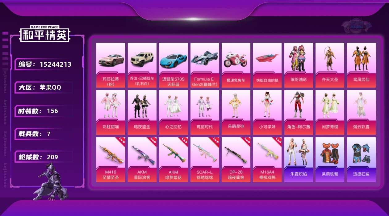 - PX_2095502- 苹果手Q-14王牌印记-5粉装-2特效枪-0载具-84520热力值-214套装-269枪皮-2卓越印记-2传奇印记 【5粉装】,天使彩虹糖,华贵君王,蜜语绒猫,冰霜白皇,香水柠檬 【2特效枪】SCAR-L-童趣迷兔-7级 M416-心之恋语-7级 【6稀有紫装】,Mark.06,8号机,雪山精英,浪漫波比,龟仙人,东方飞龙, 【215稀有时装】,SS31特训,SS33特训