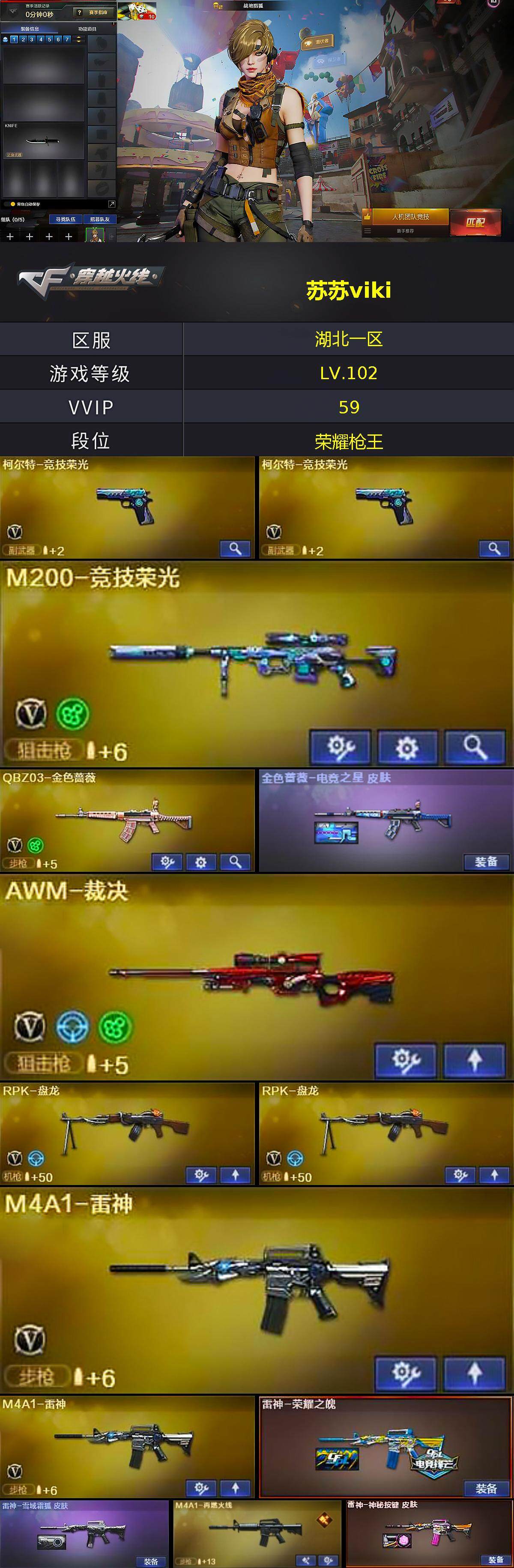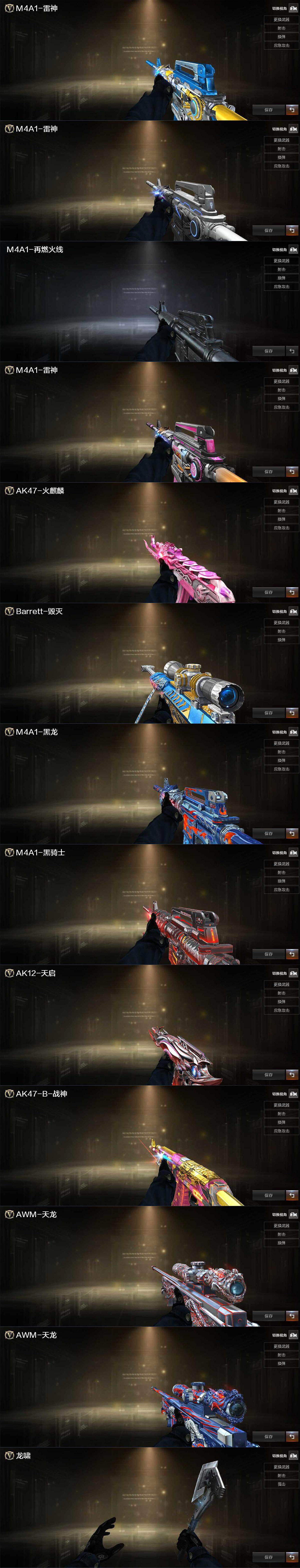 【热门武器】:QBZ03-金色蔷薇,HK417-朱雀,M200-竞技荣光,M4A1-黑骑士,RPK-盘龙*2,加特林-炼狱*2