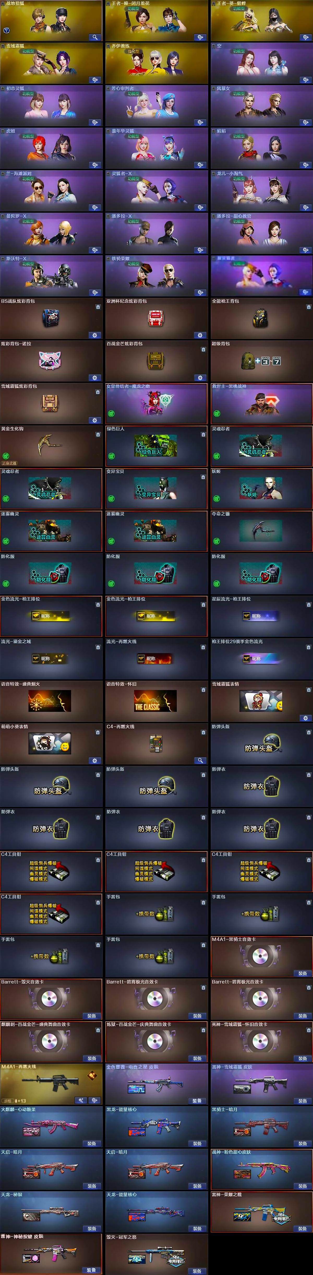 【音效卡】:M4A1-黑骑士音效卡,Barrett-毁灭音效卡,Barrett-碧霄极光音效卡*2,麒麟刺-百战金芒-盛典舞曲音效卡,炼狱-百战金芒-庆典舞曲音效卡,死神-雪域霜狐-怀旧音效卡