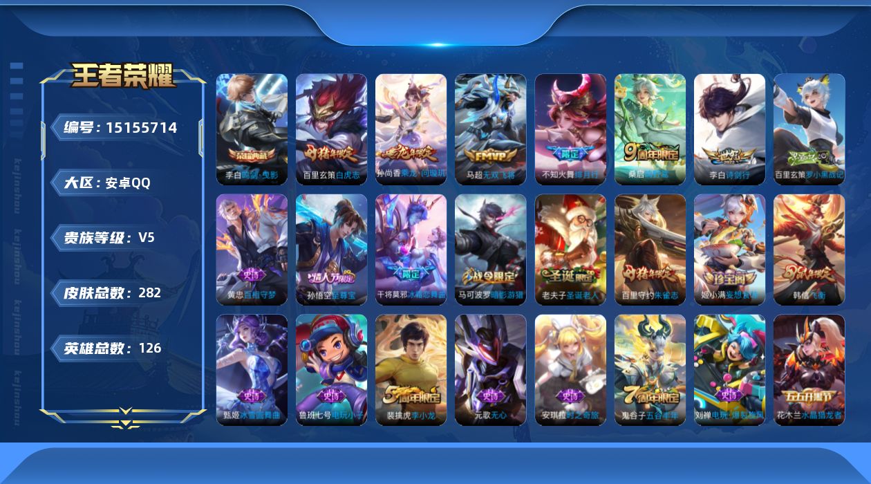 - [15125123]安卓WX-V8-最强王者段位-126英雄-242皮肤-1典藏皮肤-1珍品传说-23传说-73史诗 【英雄全皮】:孙权全皮,司空震全皮,空空儿全皮,影全皮,海诺全皮 【荣耀典藏】:铠银白咏叹调 【珍品传说】:嫦娥器灵落星盏 【传说皮肤】:杨戬纵目迁山,元歌诡秘之主,大司命死亡执政官,公孙离云诺千山,司空震愿照山河定,妲己愿照众生和,澜愿照九州拓,虞姬愿照岁时盈,云缨幻光神枪,裴擒虎祥瑞亨通,桑启鸣野蒿,庄周牧神诗旅,亚连落雪白狼,孙尚香乘龙问璇玑,孙策乘龙淬吴钩,澜逐花归海,夏洛特浮生妄,吕布怒海麟威,李白诗剑行,马超无双飞将,虞姬启明星使,曜云鹰飞将,达摩黄金狮子座 【限定皮肤】:蔡文姬夏日便利店,大乔绒语心约,虞姬夏日便利店,姜子牙天穹之誓,狄仁杰阴阳师,赵云皇家上将,妲己时之奇旅,芈月幻夜卜梦,马可波罗山海玄木吟,狄仁杰魔术师,狄仁杰万华元夜,达摩沙漠行僧,项羽海滩派对,韩信傲雪梅枪,兰陵王金庭之子,孙悟空至尊宝,刘备百相守梦,虞姬启明星使,钟馗神迹守卫,杨玉环寅虎心曲,鬼谷子原初探秘者,沈梦溪星空之诺,米莱狄胡桃异想国,云中君纤云弄巧,嫦娥暖冬兔眠,鲁班大师探海日志,桑启海盐诗旅,夏洛特浮生妄,司空震地狱燃心,蒙恬荣光圣徽,高渐离燃音魔法,妲己灵卜魔法,鬼谷子天穹祈灯,伽罗琥珀纪元,孙尚香乘龙问璇玑,孙策乘龙淬吴钩,百里玄策超元猎域,亚连落雪白狼,沈梦溪龙舞盛年,鲁班七号蔬乡物语,李元芳蔬乡物语,刘邦剑破天穹,镜青焰无极,项羽苍威无极,海诺心动手记,芈月浮光幕影,周瑜熔金海岸 【年限皮肤】:杨玉环寅虎心曲,马可波罗山海玄木吟,孙尚香乘龙问璇玑,孙策乘龙淬吴钩 【赛季限定】:狄仁杰万华元夜,达摩沙漠行僧,兰陵王金庭之子,鬼谷子原初探秘者,鲁班大师探海日志,桑启海盐诗旅,鬼谷子天穹祈灯,蒙恬荣光圣徽,刘邦剑破天穹,姜子牙天穹之誓 【战令限定】:蔡文姬夏日便利店,虞姬夏日便利店,芈月幻夜卜梦,钟馗神迹守卫,沈梦溪星空之诺,米莱狄胡桃异想国,嫦娥暖冬兔眠,司空震地狱燃心,高渐离燃音魔法,妲己灵卜魔法,鲁班七号蔬乡物语,李元芳蔬乡物语,镜青焰无极,项羽苍威无极 【史诗皮肤】:露娜紫霞仙子,赵云皇家上将,貂蝉圣诞恋歌,甄姬冰雪圆舞曲,王昭君偶像歌手,狄仁杰魔术师,廉颇地狱岩魂,宫本武藏鬼剑武藏,孙尚香水果甜心,嬴政暗夜贵公子,嬴政摇滚巨星,妲己魅力维加斯,墨子金属风暴,