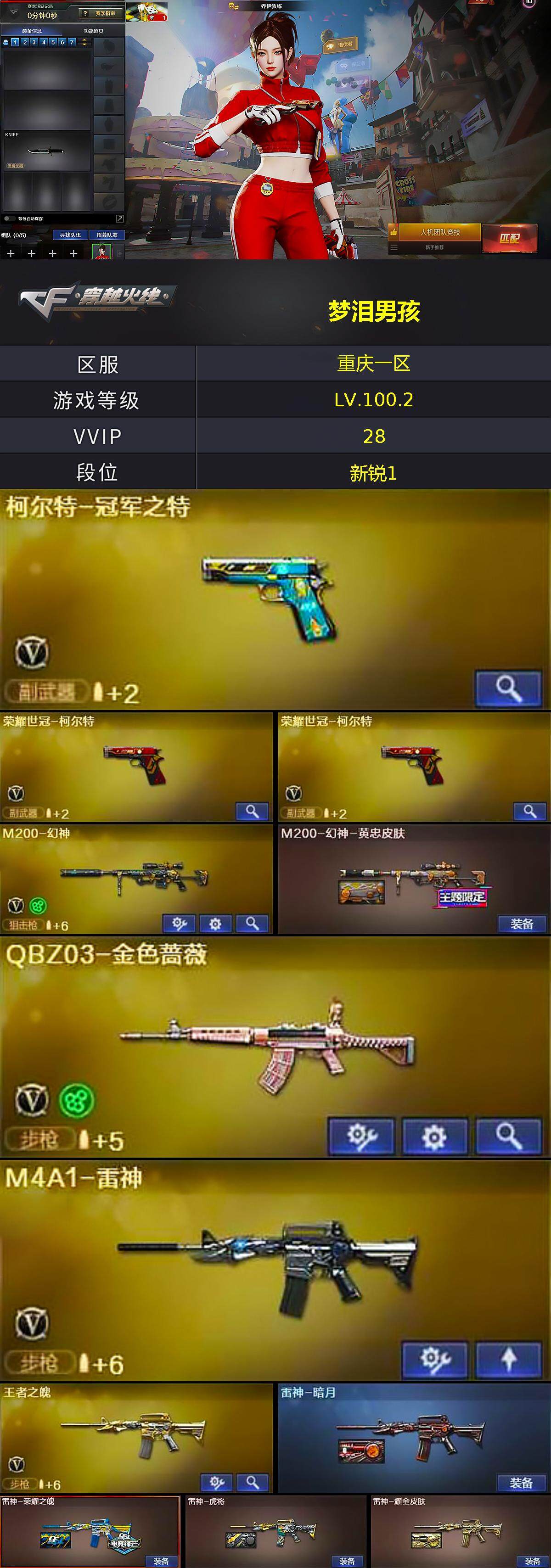 [15246149]重庆一区-28V-4王者-0炫金 【热门武器】:QBZ03-金色蔷薇,M4A1-青龙,M200-幻神,柯尔特-冠军之特,荣耀世冠-柯尔特*2,M4A1-黑骑士 【音效卡】:M4A1-黑骑士音效卡 【皮肤】:M200-幻神-黄忠皮肤,雷神-暗月,雷神-荣耀之魄,雷神-虎将,雷神-耀金皮肤,火麒麟-雷神,火麒麟-华夏之心,火麒麟-平天大圣,火麒麟-心动糖果,毁灭-战神张飞,黑龙-暗月,黑骑士-暗月 【角色】:乔伊教练,暗夜-X,嘉年华灵狐,灵狐者-黄金海岸,龙儿,玫瑰花神,潘多拉-X,新灵狐者,新娜塔莎,雪莉杨-摸金校尉,影武者-X 【人偶武器】:M4A1-雷神-精英刀锋,AWM-灵狐-15周年嘉年华,海滩汪汪-巴雷特,迷你牛牛,迷你生化手雷,深渊终结者手雷,灵狐娃娃手雷 【暴走生化】:超级对讲机 【英雄级武器】:AK47-火麒麟,M4A1-黑龙,M4A1-雷神,M4A1-黑骑士,M4A1-青龙,无影-神兵利器,黑武士-锦绣游龙,M4A1-玫瑰精灵,QBZ03-金色蔷薇,烈火-动感闪耀,王者之影-觉醒版,王者之武-觉醒版,王者之魄-觉醒版,AK-47-猩红传说,Barrett-毁灭,Barrett-极光,M200-幻神,沙鹰-天神,柯尔特-冠军之特,荣耀世冠-柯尔特*2,天神-动感闪耀,龙啸,擎天,屠龙-动感闪耀,王者之锋-觉醒版,高爆手雷-竞技荣光*2,手雷-动感闪耀,闪光弹-竞技荣光,烟雾弹-幻灵*2 【道具】:茸茸松狮背包,CFS限定背包,XROCK炫彩背包,亚洲杯纪念炫彩背包,超级背包,救世主-黑桃战神,绿色巨人,灵魂忍者*2,变异宝贝,迷雾幽灵,生化弹匣,夺命之镰,防化服*2,金色流光-枪王排位*2,星辰流光-枪王排位,枪王排位28赛季金色流光,枪王排位29赛季金色流光,动感闪耀表情,防弹头盔*8,防弹衣*10,C4工具钳*6,手雷包*3 【特殊枪械】:1黑骑士