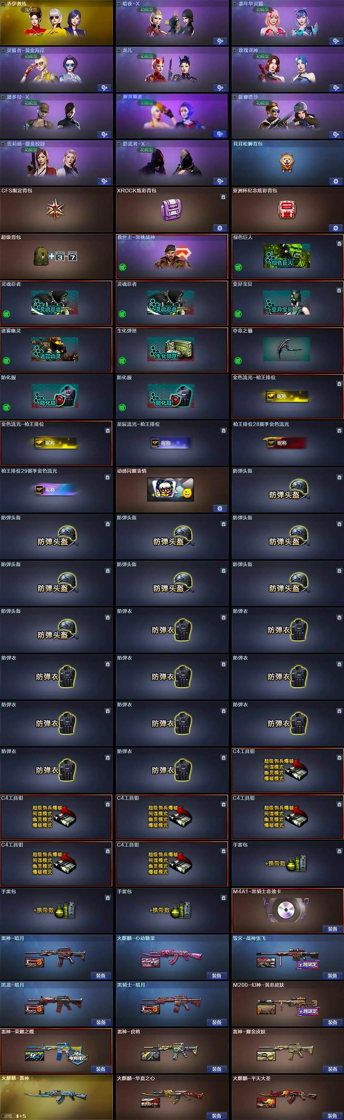 【道具】:茸茸松狮背包,CFS限定背包,XROCK炫彩背包,亚洲杯纪念炫彩背包,超级背包,救世主-黑桃战神,绿色巨人,灵魂忍者*2,变异宝贝,迷雾幽灵,生化弹匣,夺命之镰,防化服*2,金色流光-枪王排位*2,星辰流光-枪王排位,枪王排位28赛季金色流光,枪王排位29赛季金色流光,动感闪耀表情,防弹头盔*8,防弹衣*10,C4工具钳*6,手雷包*3