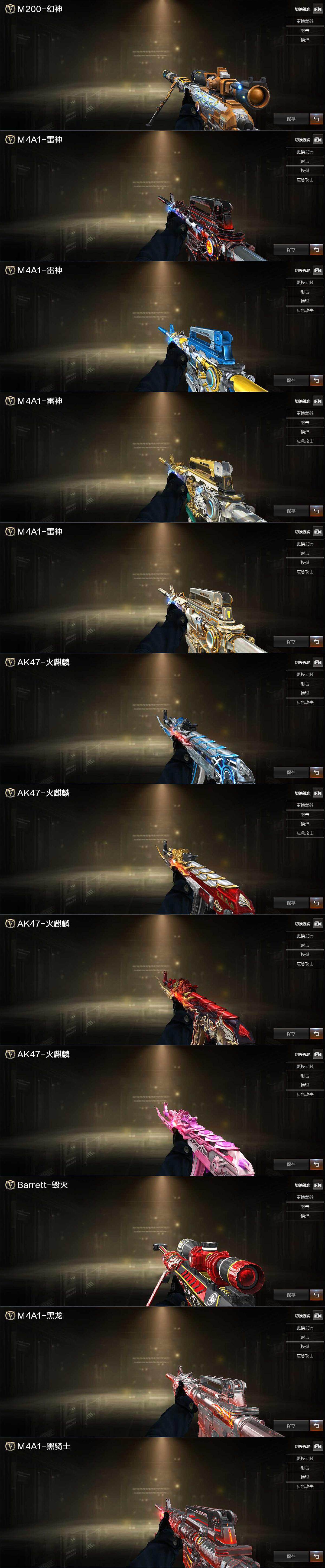 【英雄级武器】:AK47-火麒麟,M4A1-黑龙,M4A1-雷神,M4A1-黑骑士,M4A1-青龙,无影-神兵利器,黑武士-锦绣游龙,M4A1-玫瑰精灵,QBZ03-金色蔷薇,烈火-动感闪耀,王者之影-觉醒版,王者之武-觉醒版,王者之魄-觉醒版,AK-47-猩红传说,Barrett-毁灭,Barrett-极光,M200-幻神,沙鹰-天神,柯尔特-冠军之特,荣耀世冠-柯尔特*2,天神-动感闪耀,龙啸,擎天,屠龙-动感闪耀,王者之锋-觉醒版,高爆手雷-竞技荣光*2,手雷-动感闪耀,闪光弹-竞技荣光,烟雾弹-幻灵*2